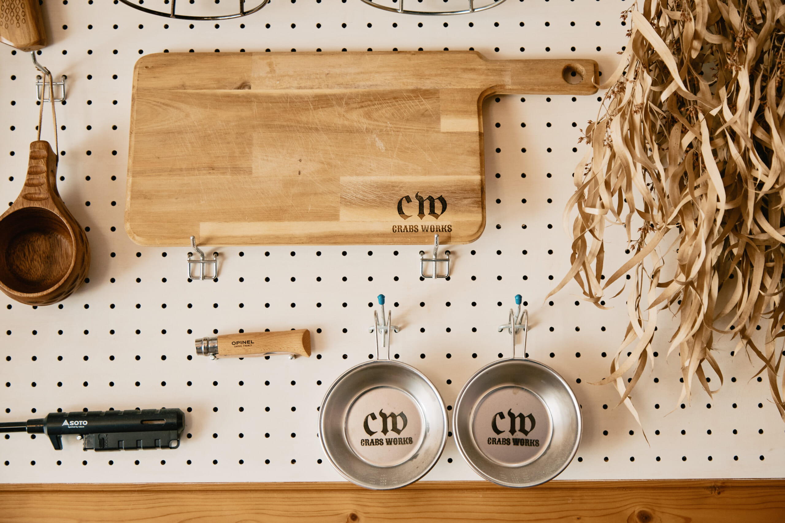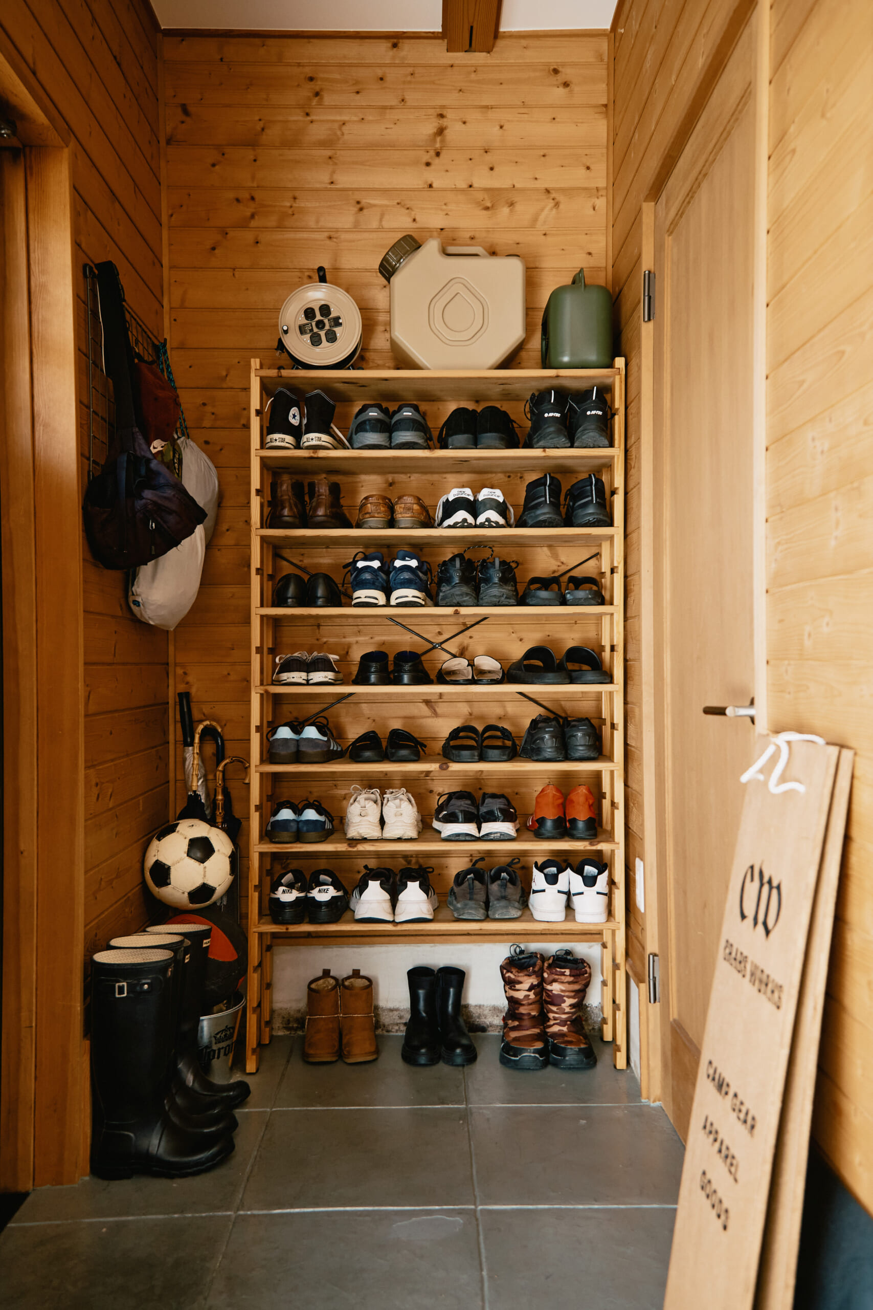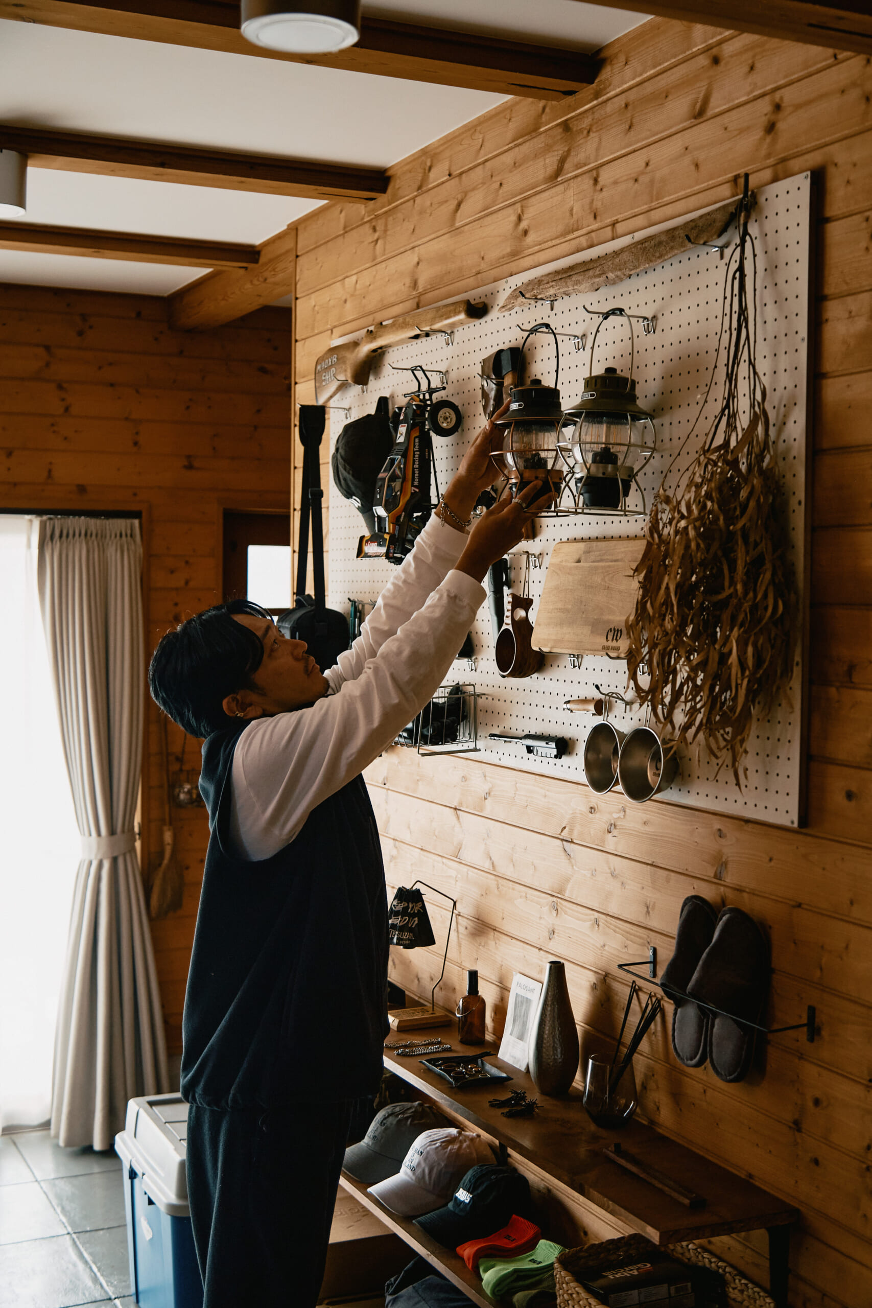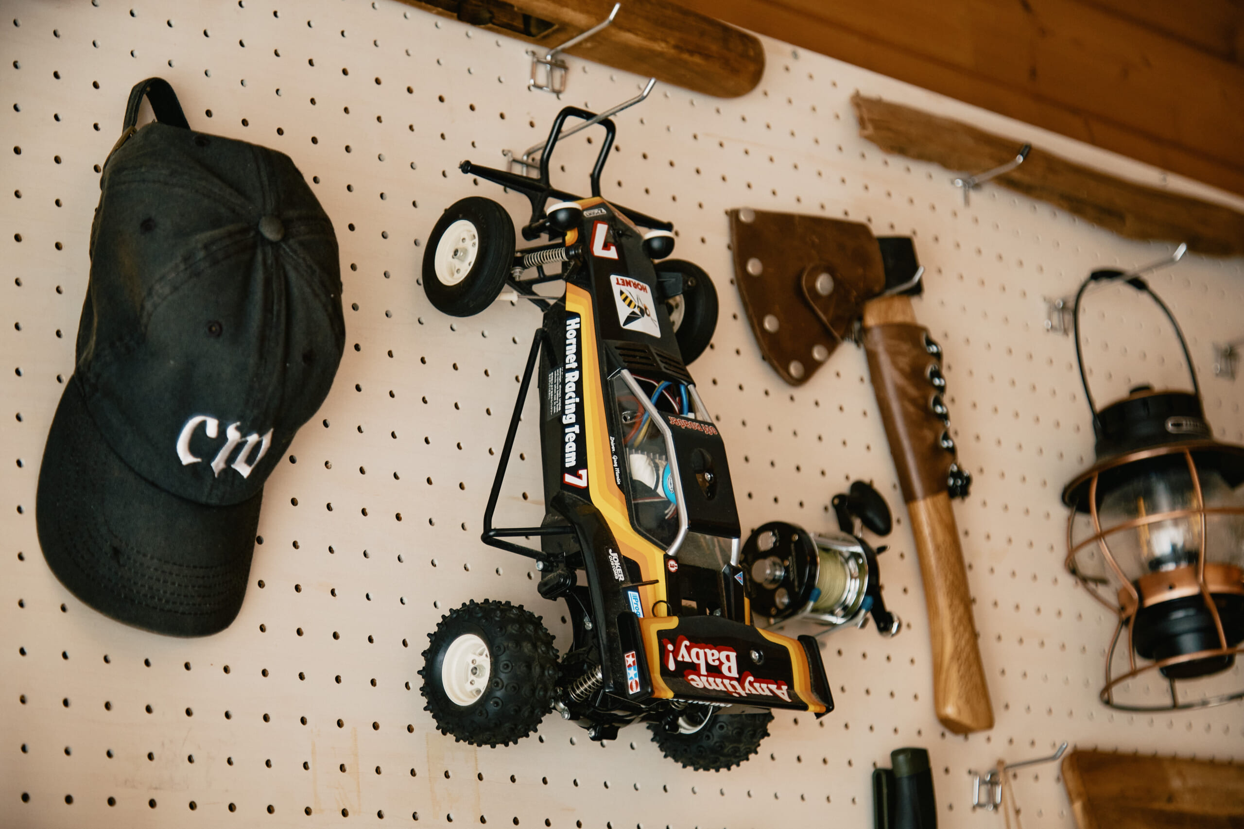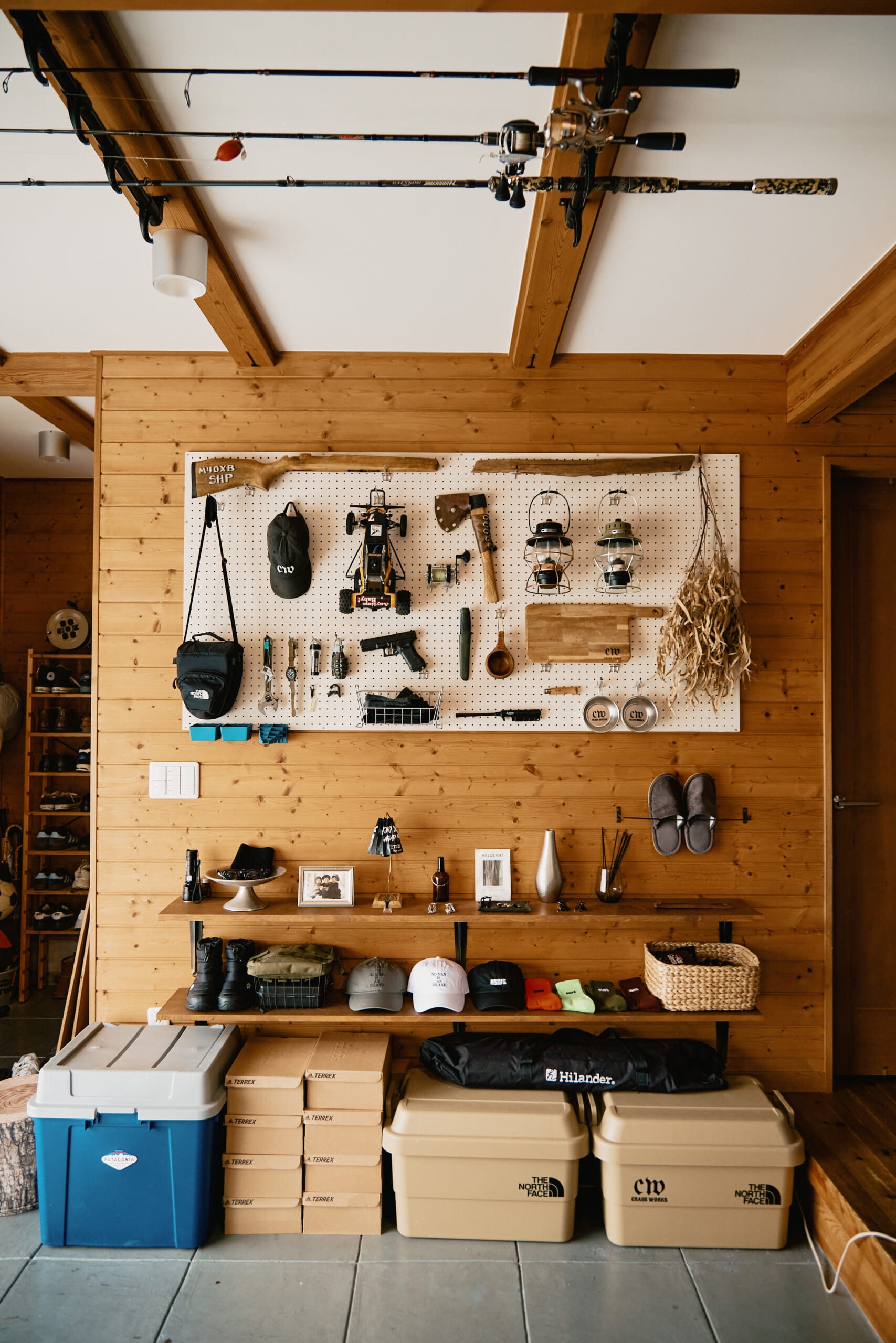 玄関入ってすぐの“土間”を見ると一目瞭然、真也さんの趣味はアウトドア。DIYで取り付けた有孔ボードには、そのときのお気に入りギアを並べています。「最近ラジコンも購入しました。まだキャンプに持ち出せていないので、早く走らせたいですね」。ほかにも自ら手がけるガレージブランドのアイテムもズラリ。