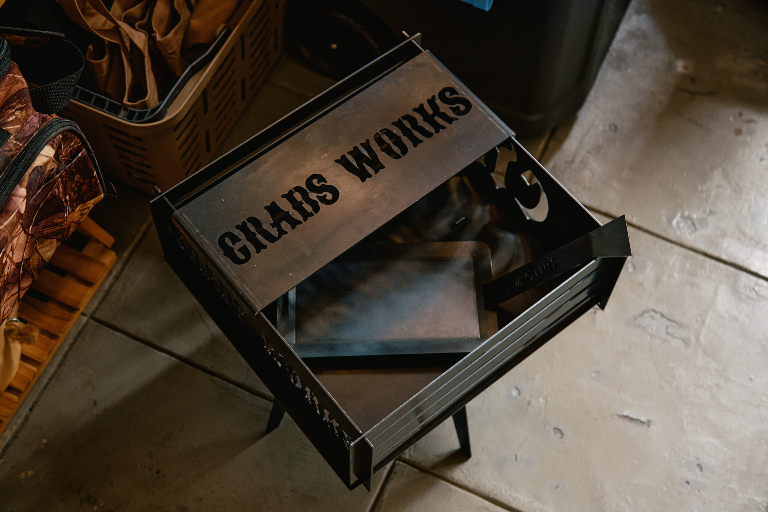 家族ではじめたキャンプ。増えるギアは防災のことも考え、階段下が定位置に。その中にはオリジナルで手がけるCRABS WORKSのギアも。キャンプへ行くにつれ「こんなアイテムが欲しいな」と思う機会が増えたとのことでガレージブランドを立ち上げた。近所の町工場へ売り込みに行き、焚き火台をプロデュース。プレートを組み合わせるギミックで、コンパクトに収納できるのもこだわり。