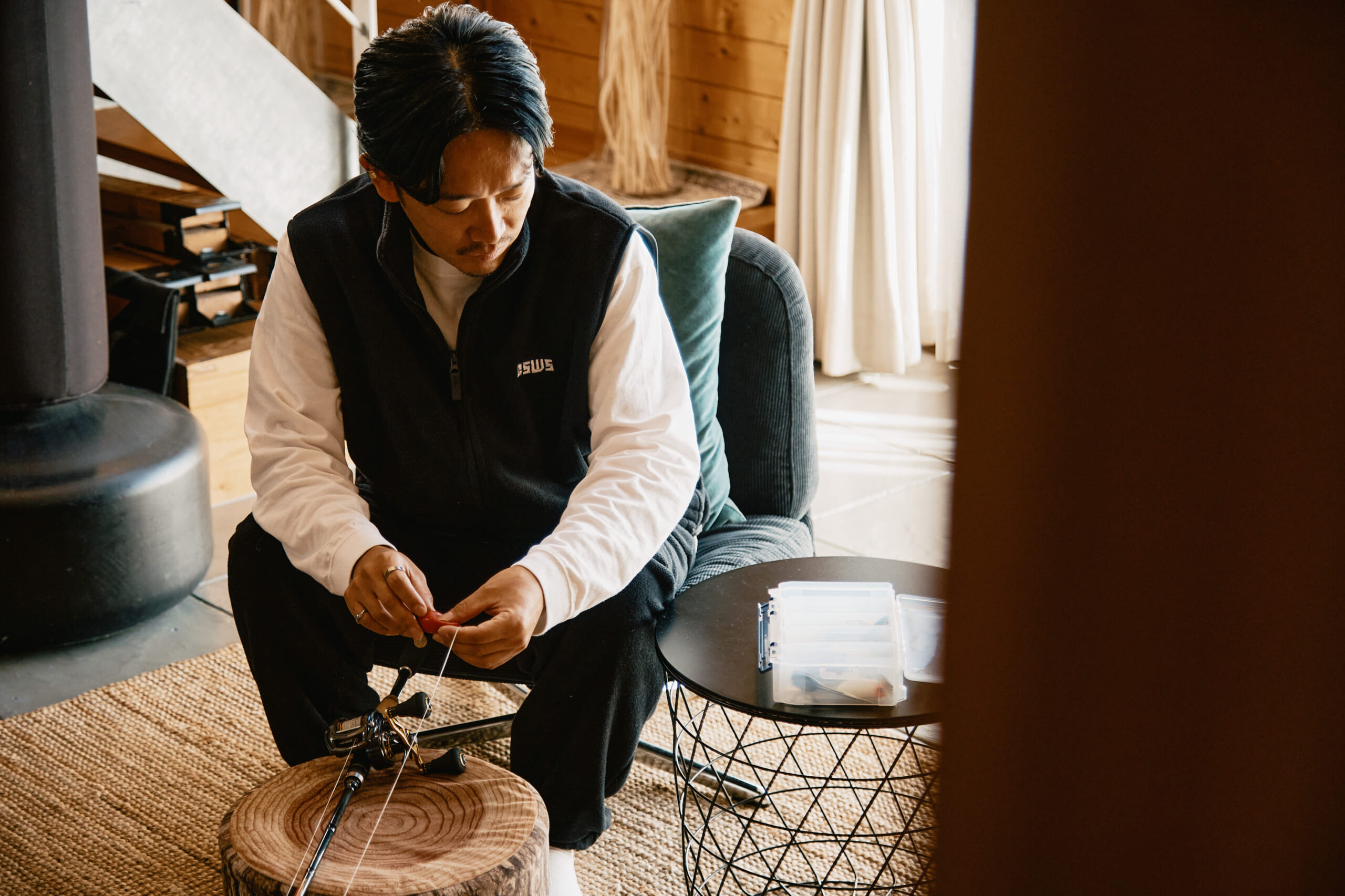 真也さんはこの家を建てたエリアが地元。学生の頃からクルマで1時間ほどの場所が、雷魚が有名なスポットで、最近は友人と釣りへ行く機会が増えたとか。「釣りの道具は海から渓流、バス釣りまでひととおり揃っています」。土間の天井にはロッドホルダーを設置し、収納スペースとしても活用。