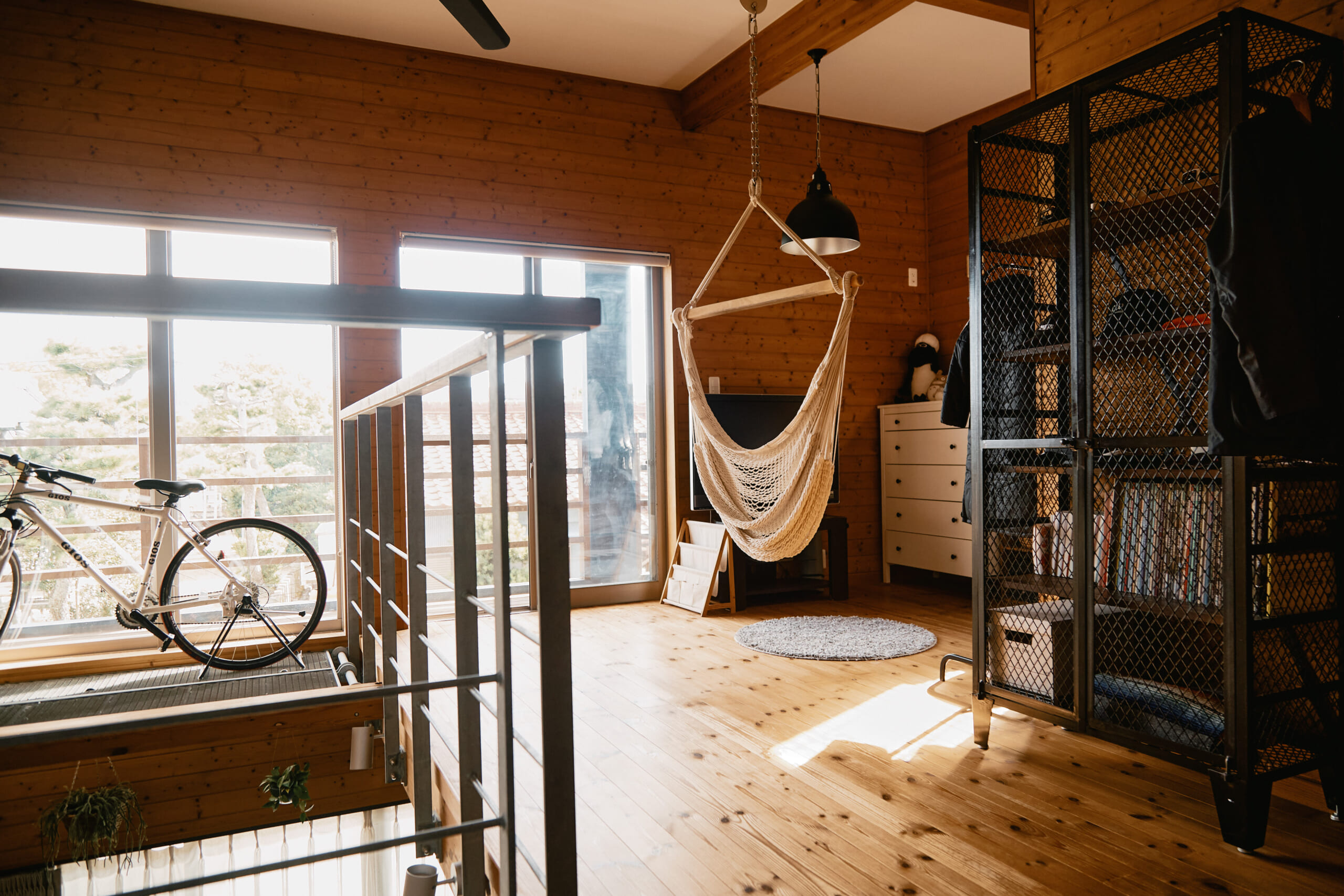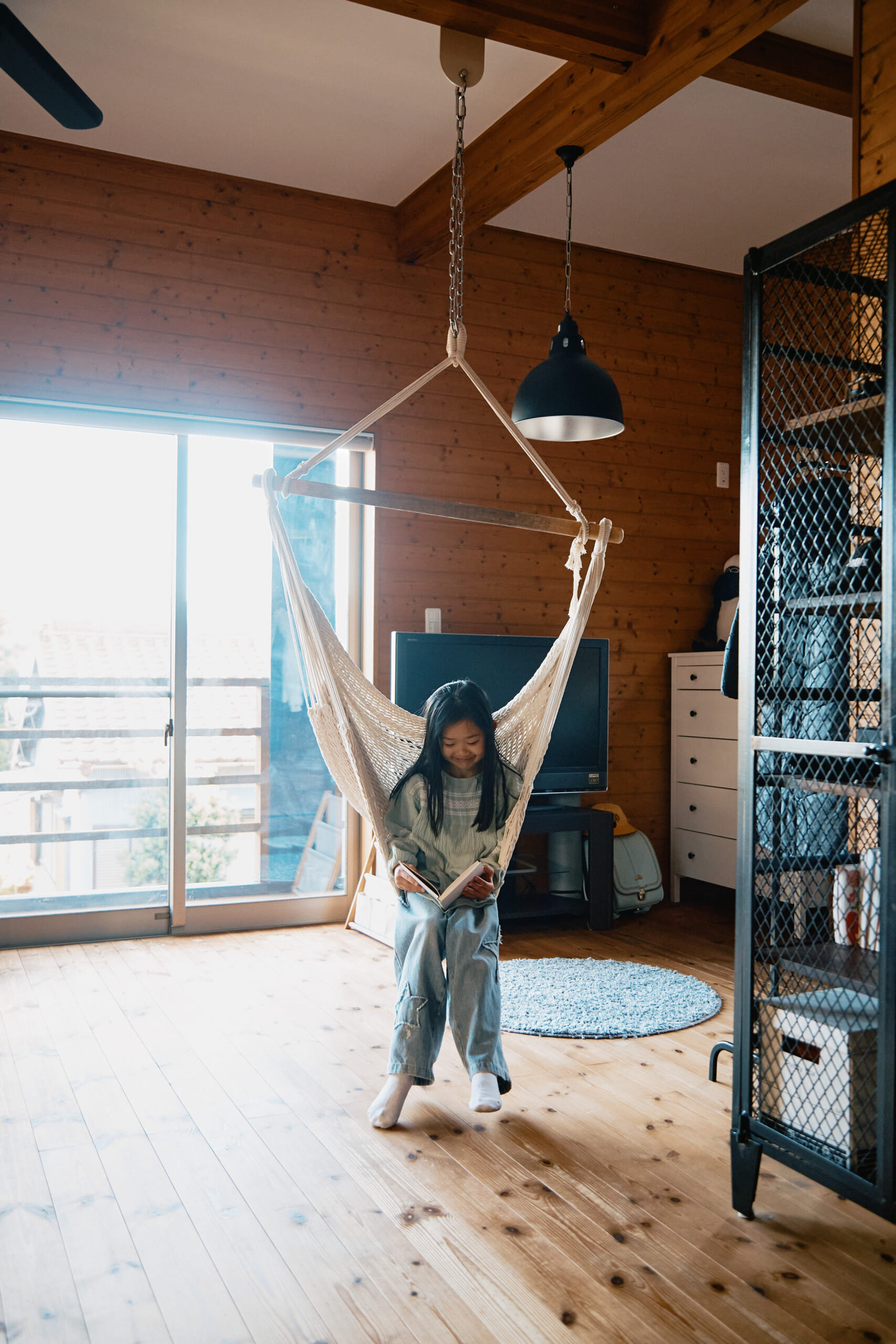 夫婦の好きが凝縮された“土間”だけでなく、家族にとっても楽しみが散りばめられた伊藤家。子どもたちの成長に合わせ、2階は2部屋あるうちのひとつを兄と弟が使う部屋として、“ロフト”を妹のスペースとしてレイアウト。ここに吊り下げられたハンモックは、のんびりすることも遊ぶこともできるため、子どもたちから大人気!
