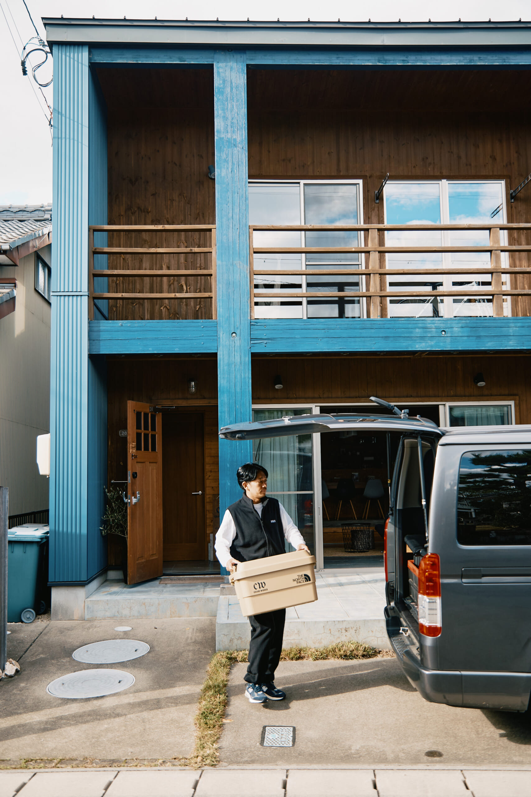 これらのアイテムは、休日などの空いた時間を使い真也さんがデザイン。土間の横にある小部屋は在庫管理とデザイン作業用スペースとして活用。ギアのほかにもアパレルなどを展開し、最近は地域のマルシェなどに出展している。「ブランド名の由来は地元・蟹江町を文字ったもの。ギアを作る工場も地元ですし、少しでも地域を盛り上げられるようにと思い、今は活動しています」。