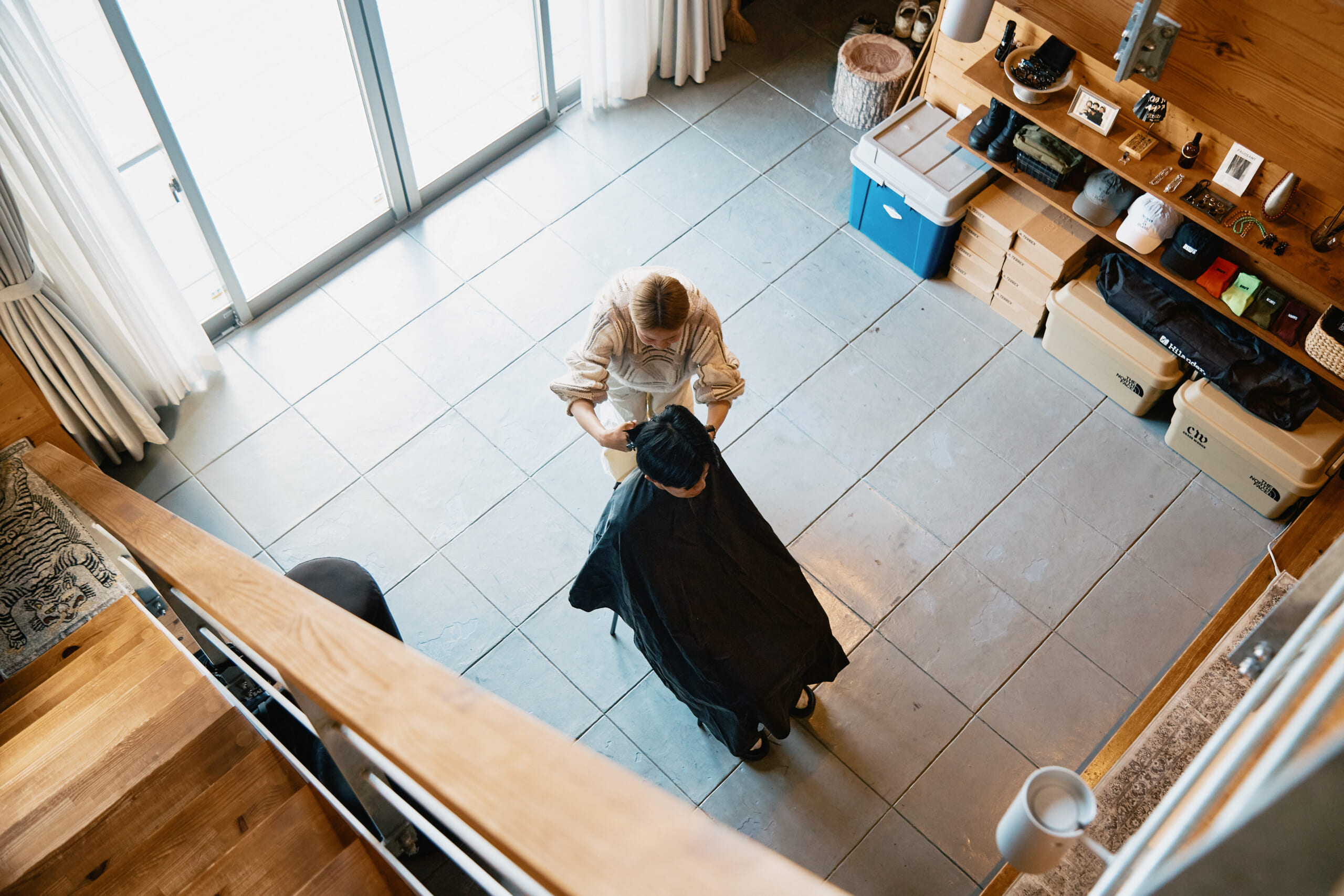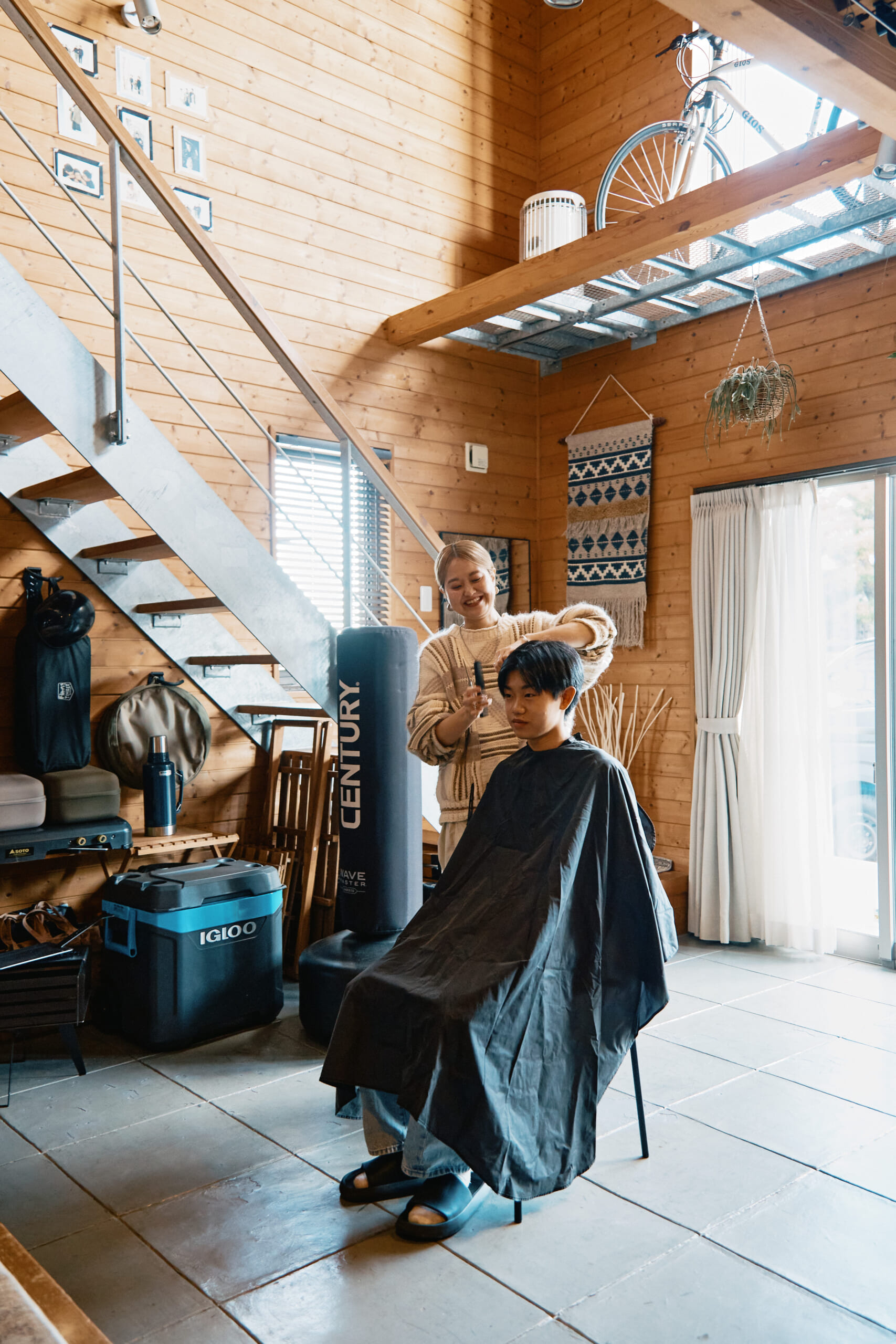 家族全員が快適に過ごせる空間づくりだけでなく、その活用方法にも団らんの秘訣が。美容師免許を持っているかおりさんは、土間を使って家族のヘアカットをしているとか。「旦那さんと子どもたちだけでなく、ワタシの両親のヘアカットやカラーもここで行います」。掃除も簡単にできる土間は、趣味スペースだけでなく家族が集まる空間としても大活躍していました!