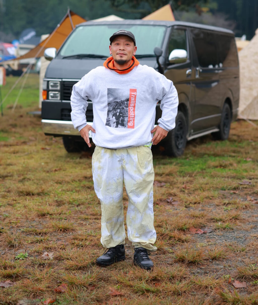 お揃いのジャケットとバックパックのコーデで雨のスーパーハイキングを満喫していた、おしゃれ夫婦の2人。「ウエーブ ヌー GTX」をカラバリでチョイスし、テーパードのきいたシンプルなリブパンツに、フィールド感のあるデザインがマッチしている。