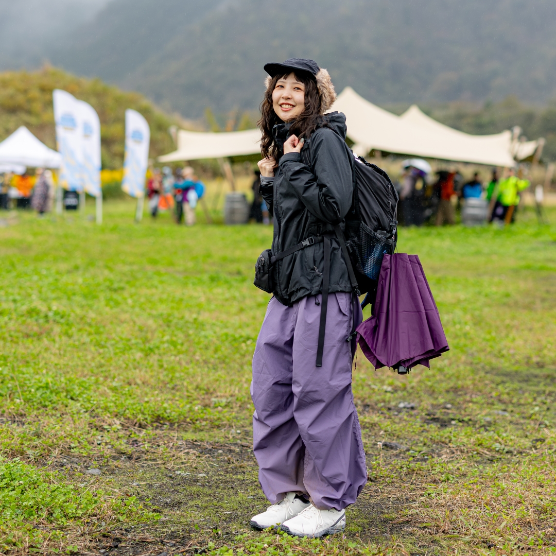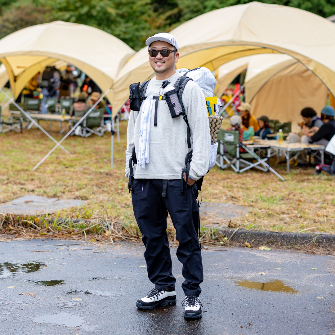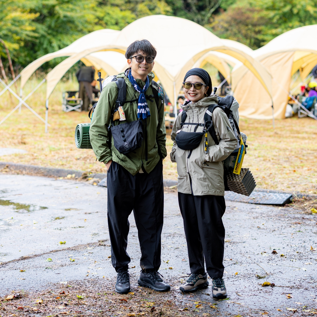 お揃いのジャケットとバックパックのコーデで雨のスーパーハイキングを満喫していた、おしゃれ夫婦の2人。「ウエーブ ヌー GTX」をカラバリでチョイスし、テーパードのきいたシンプルなリブパンツに、フィールド感のあるデザインがマッチしている。