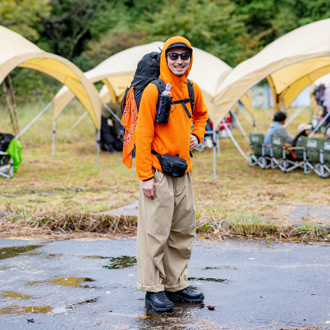 ロールアップしたベージュのワイドパンツと、丸みを帯び、ボリューム感のあるデザインが特徴的な「ウエーブ OD GTX」のブラックが相性バツグン。バンダナも色合わせしたビビッドなオレンジのフリースフーディも相まって、バランスのいいコーデに。