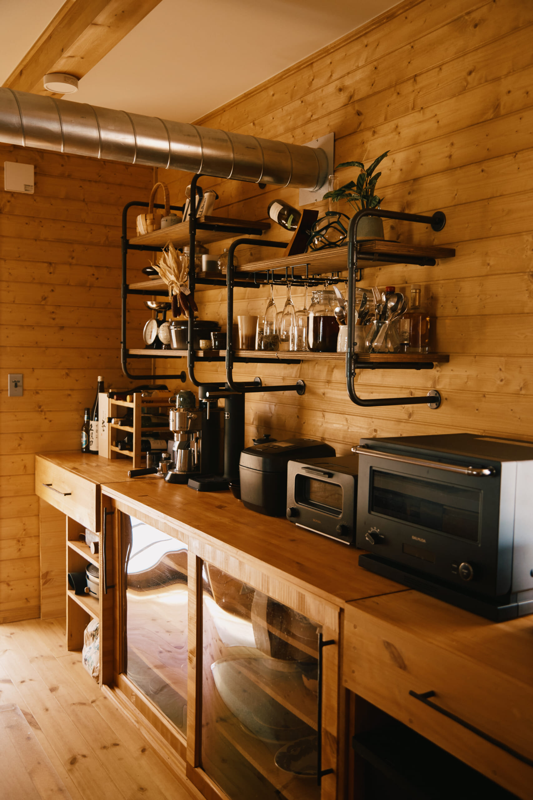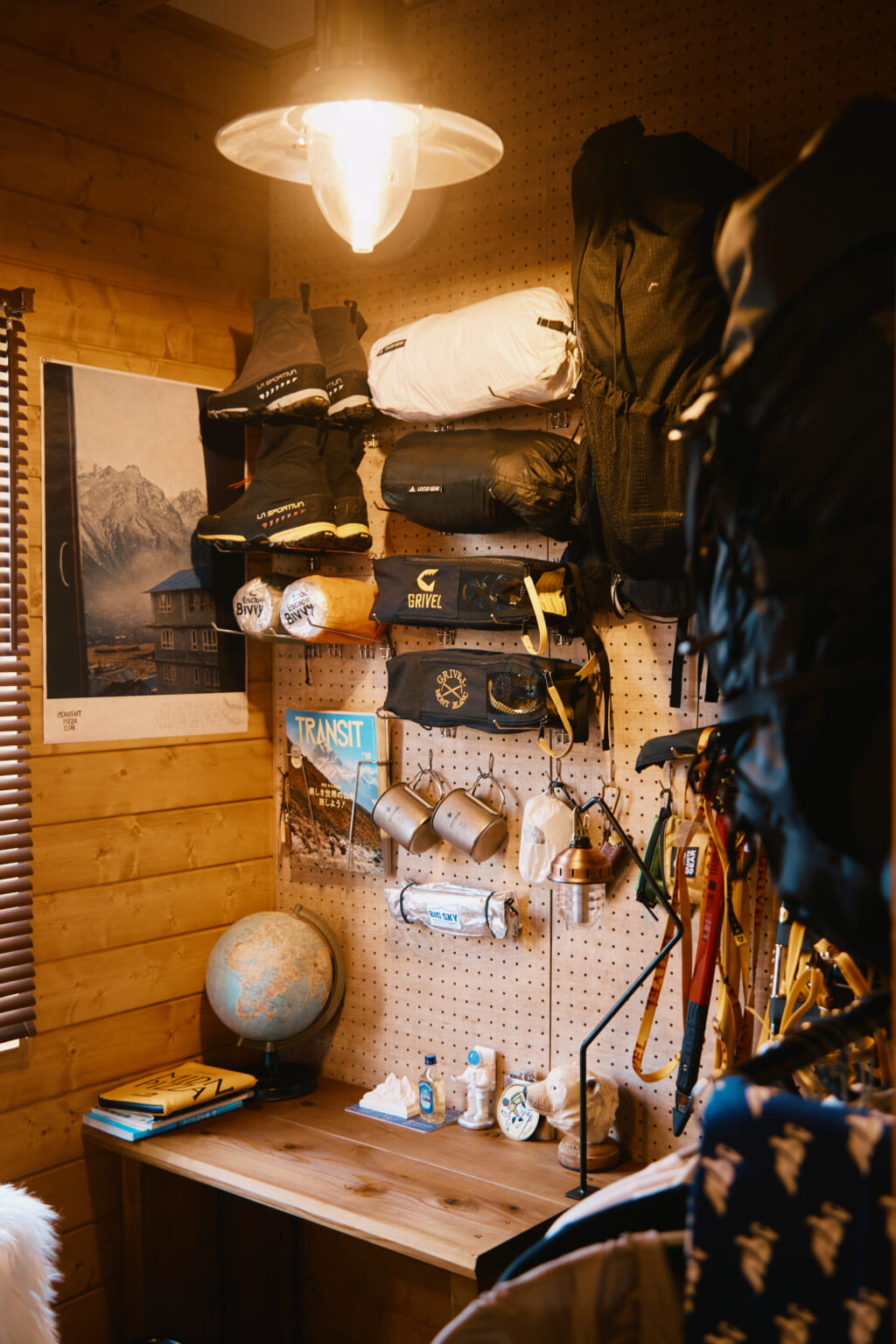 キッチン奥に取り付けた配管を使ったウォールラックは、大阪にある上手工作所でオーダーし、壁付けにしている棚はすべて美咲さんによるDIY。モデルルームでサイズを測り、家の建設中に着手。ダボを使いネジ頭を目隠しするクオリティの高さ! またリビング後ろにある納戸は、キャンプや登山に使うアウトドアギアの収納に。こちらもDIYでディスプレイ兼収納を作っていました。