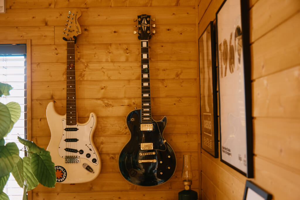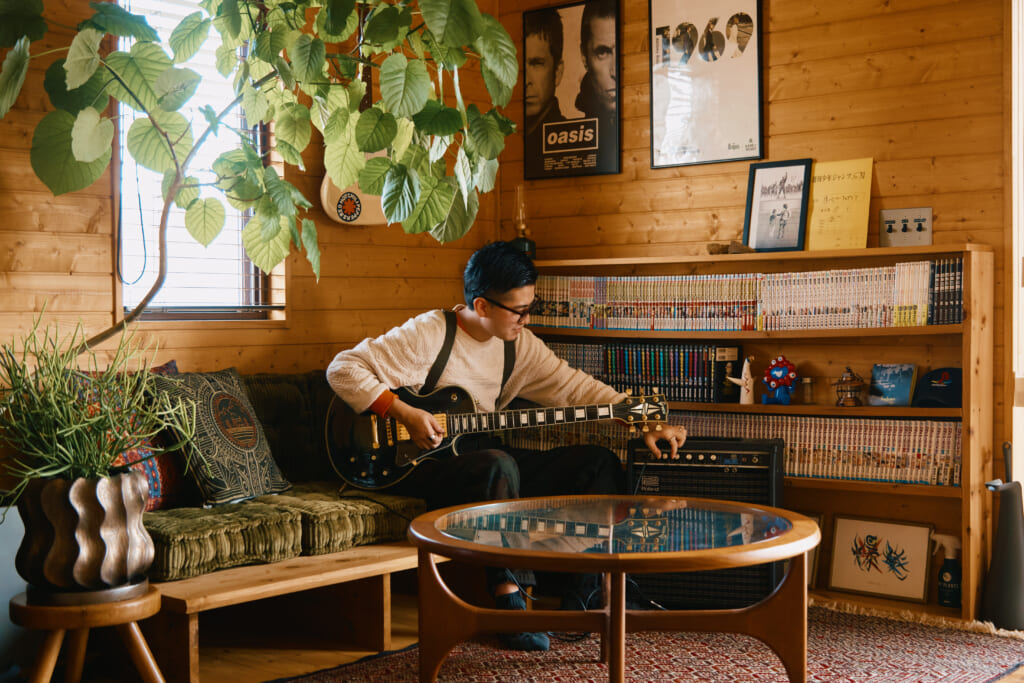 喜大さんが主に好きというUKロック。家中にアーティストのライブグッズやポスターが飾られるほか、2階のロフトは夫婦の趣味スペースには、マンガをずらりと並べた棚のほか、高校時代にバンドを組んでいたという喜大さんのギターも。
