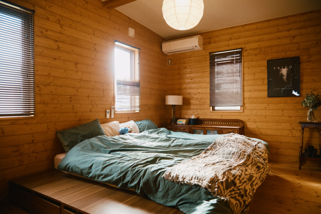 2階の2部屋はそれそれ主寝室とゲストルームに。家を建ててから友人を招く機会が増え、週未のおウチ時間が増えた。キャンプ用のコットを常時置いているため、いつでも寝泊まりできるようになっています。
