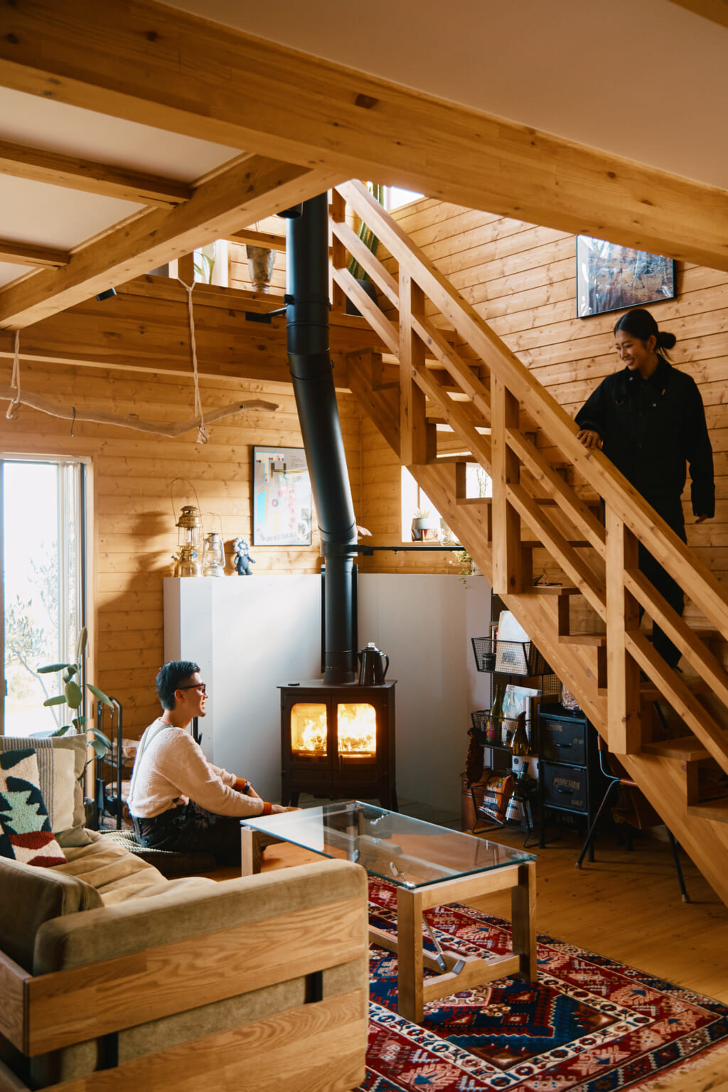 薪ストーブも、絶対に取り入れたかったアイテムのひとつ。キャンプ好きなこともあり、家の中でも焚き火をしている気分を味わえるため、ストーブの前に座椅子やクッションを出しくつろぐことも。本格的に寒くなる季節を迎えるため、薪のストックが欠かせない。