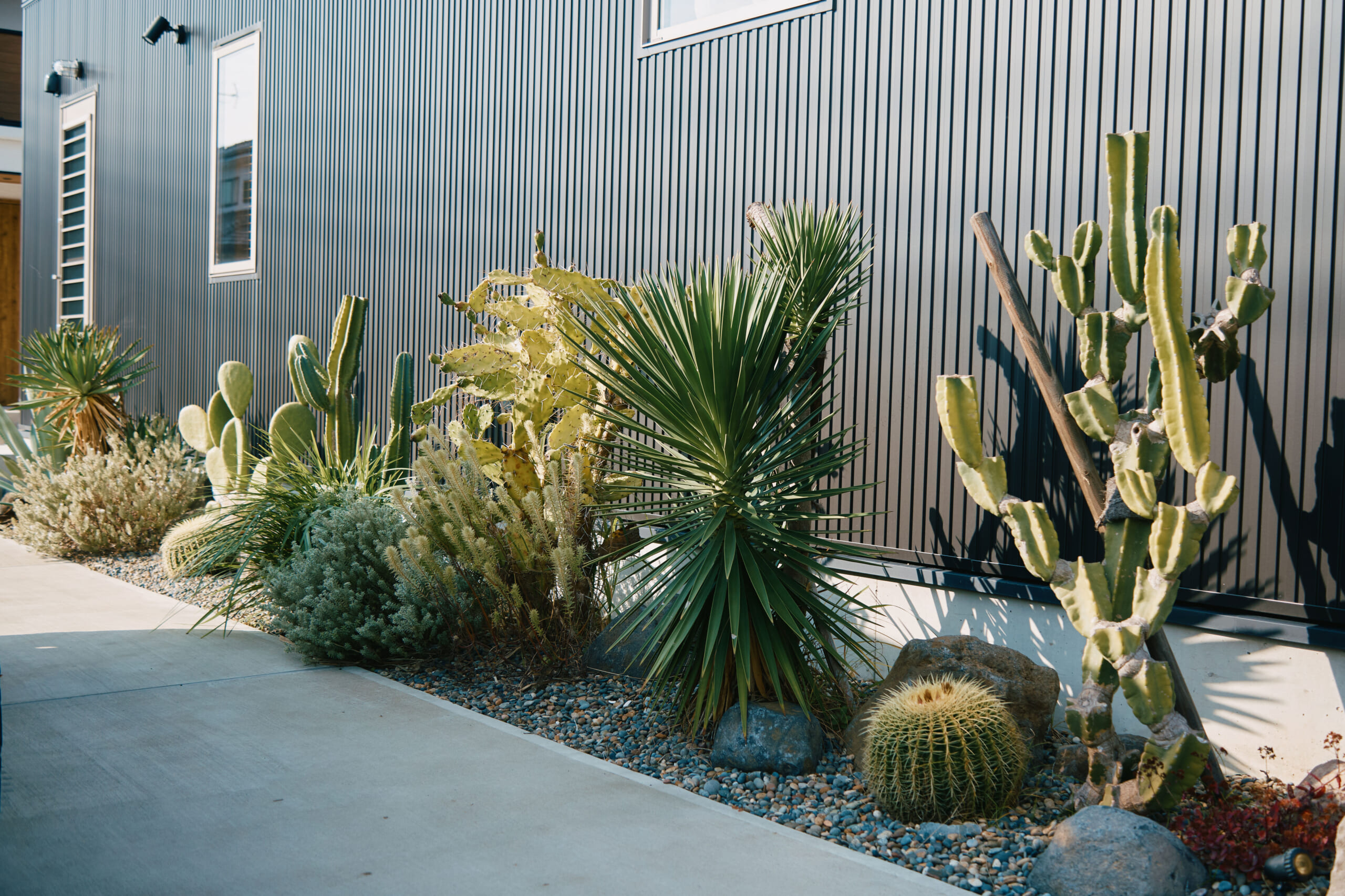 引っ越し後は、庭でキャンプが楽しめるからと登山にもっぱら夢中な様子で、壁にはこれまで登った日本の百名山ピンバッジを飾るディスプレイボードが。またグリーンも新しい趣味のひとつ。散歩中に見つけたショップで植物を購入していたが、植栽も依頼できると知りオーダー。外構もお気に入りポイントのひとつで、今後もサボテンを中心に庭作りを進めていく予定。