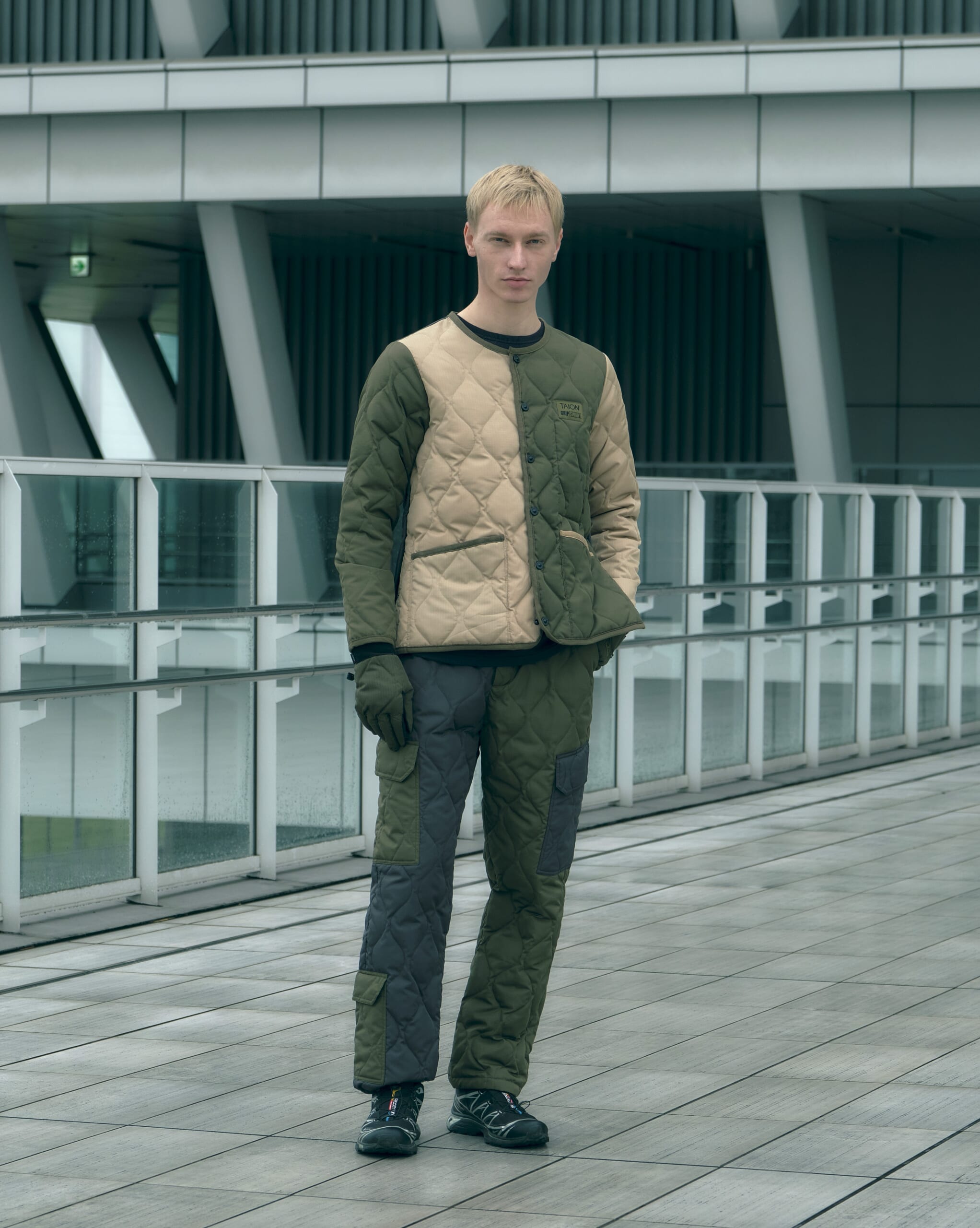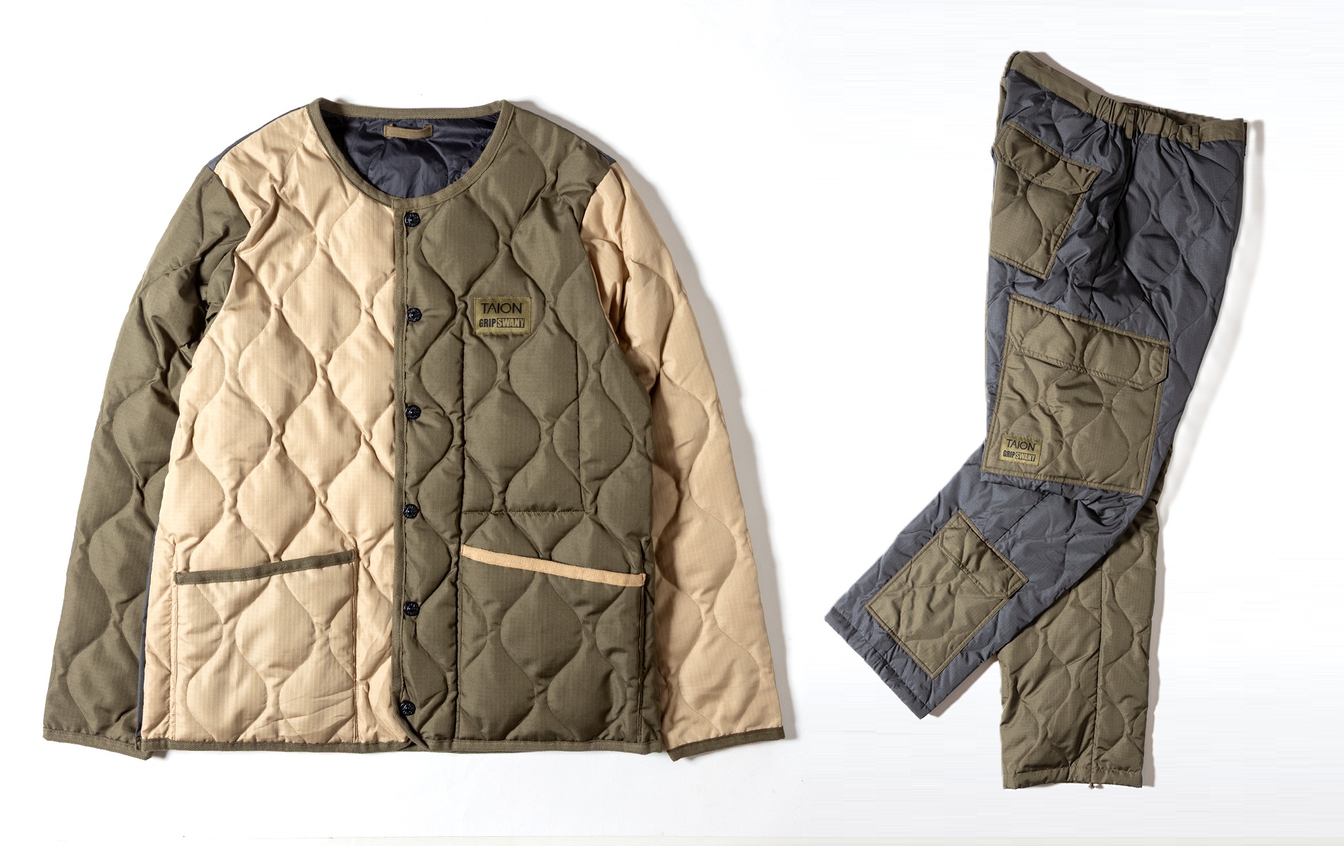 TAIONミリタリーラインのクルーネックWジップジャケット&パンツがベース。高密度の生地に保温性に優れる800FPダウンを採用。ヘチマキルトが優しい印象で、立体感を演出する。なお上下ともOリングが設けられた三角パッチにカラビナが付属し、コードなどに掛けられるようになっているのも特徴だ。
