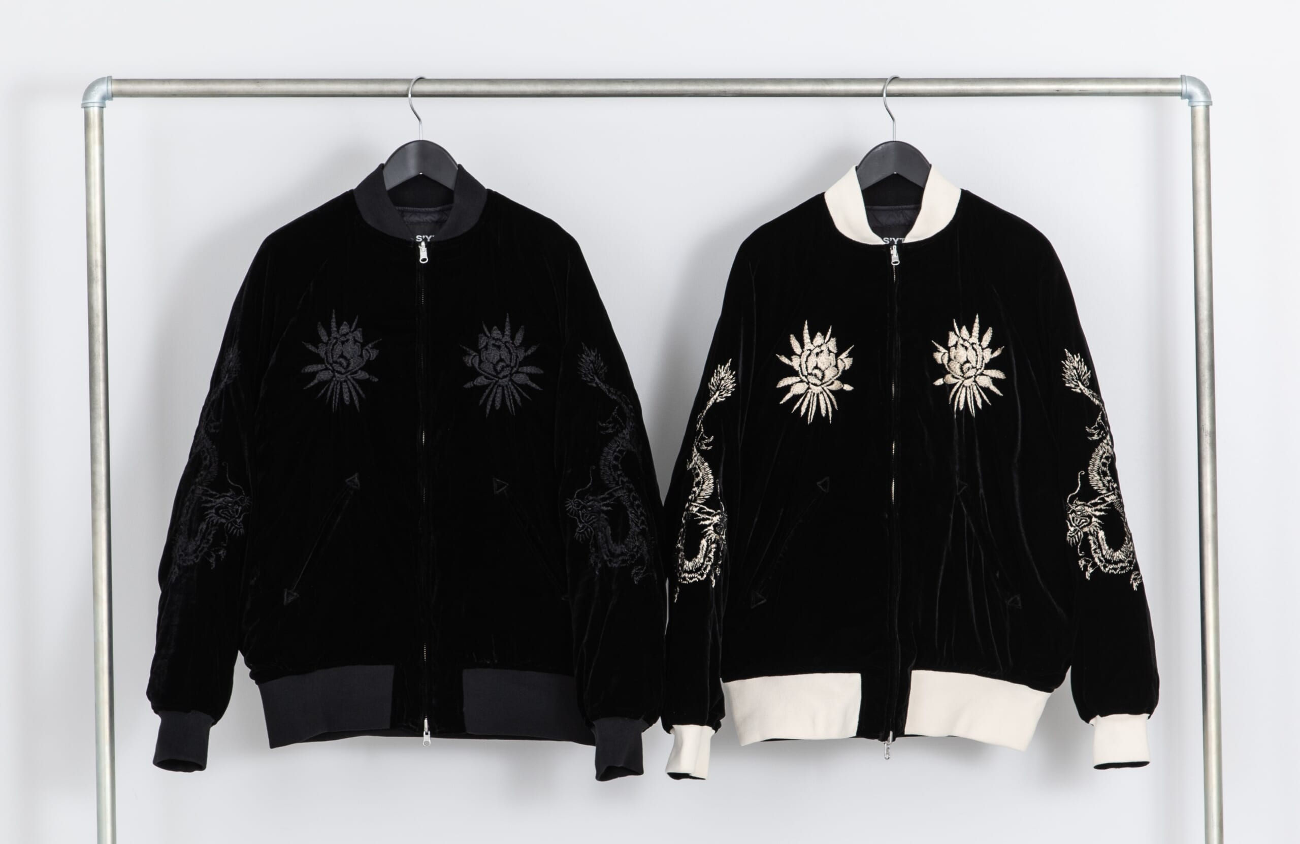 他アイテム同様にリバーシブル仕様で、表面にはソフトなクラッシュタイプのレーヨンベルベットを採用。胸元や袖、背面にはS’YTEアーカイブデザインの刺繍が施されている。ヤンチャなイメージの強いアイテムをエレガントに昇華!
