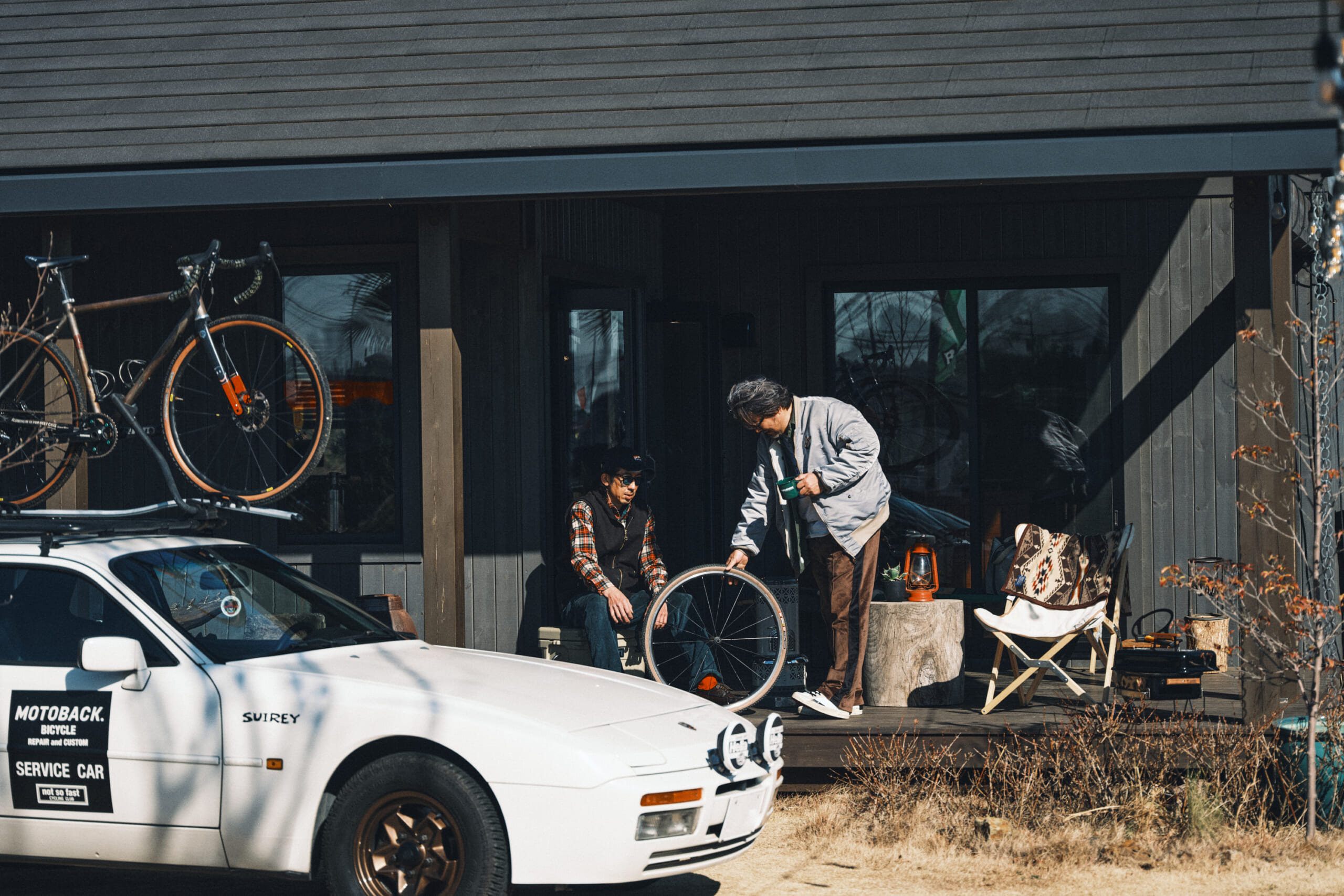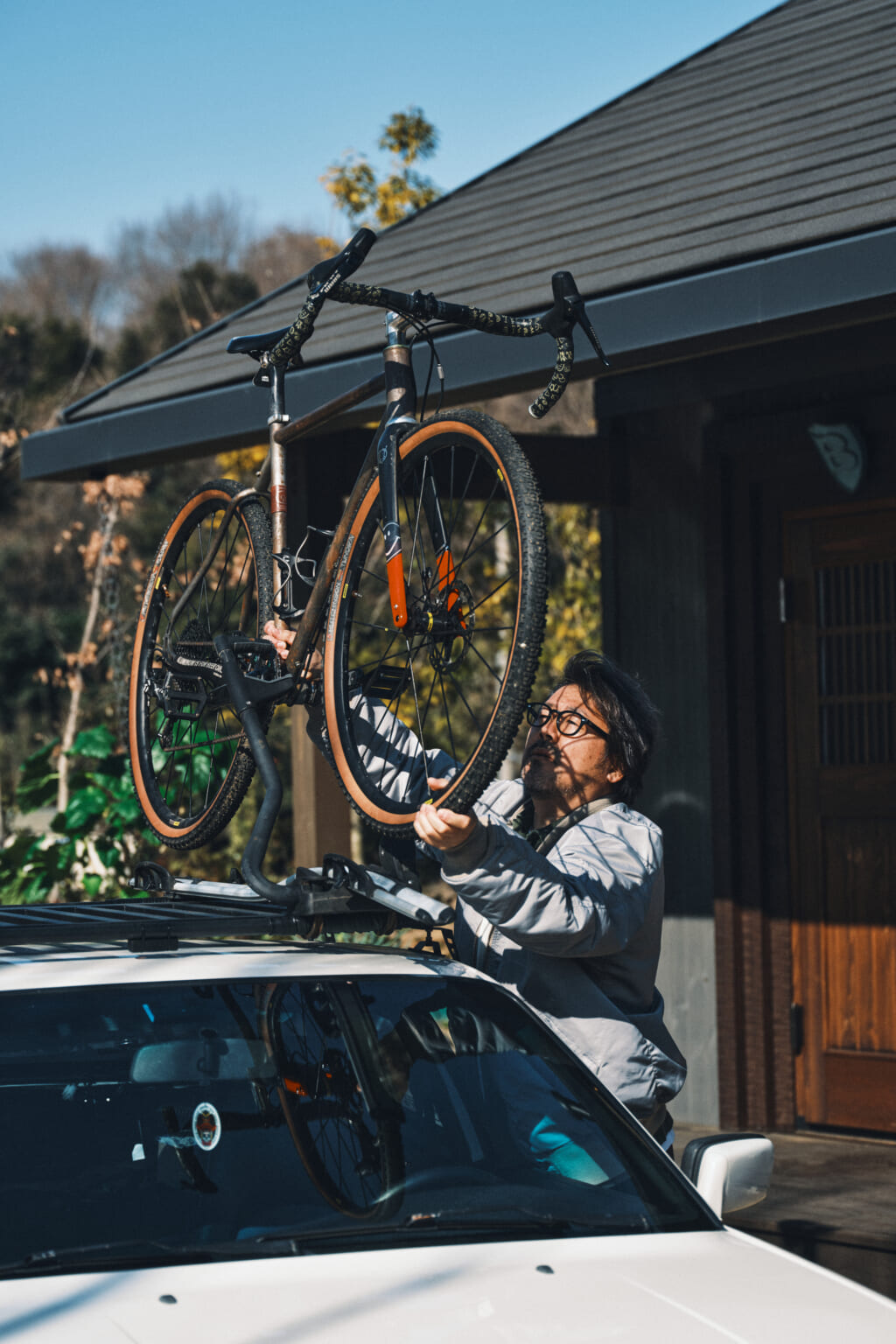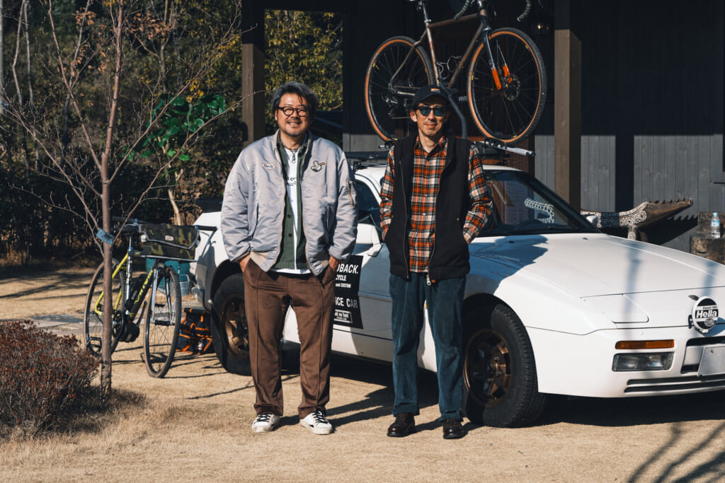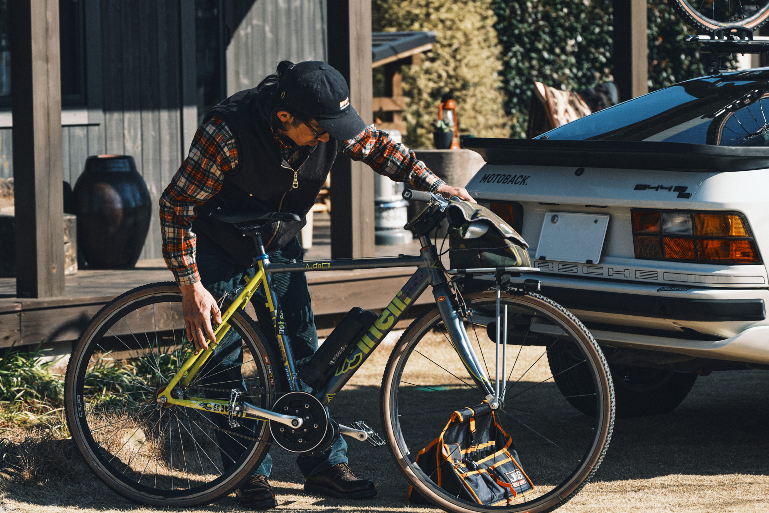 TOMOさんが今回乗ってきたのは1989年式のポルシェ944 S2。リフトアップしてクッキー型ホイールにオフロードタイヤを合わせ、ラリーカー風味にカスタムした1台。グラベルバイクやスマチャリ搭載のクロスバイクを積載し、フィールドでの自転車遊びを楽しんでいる。