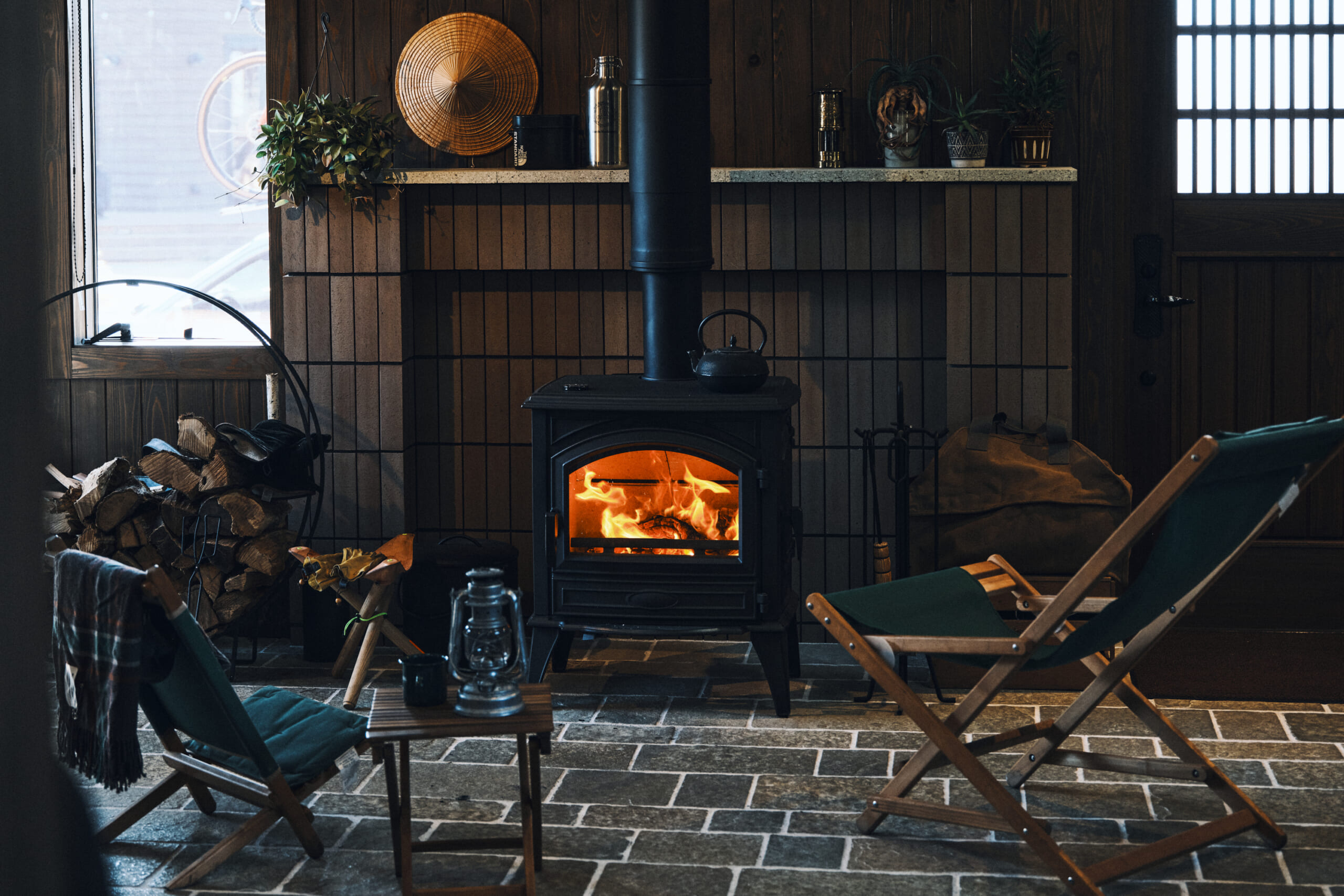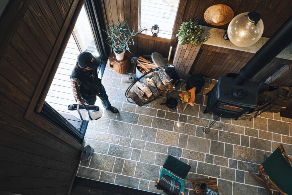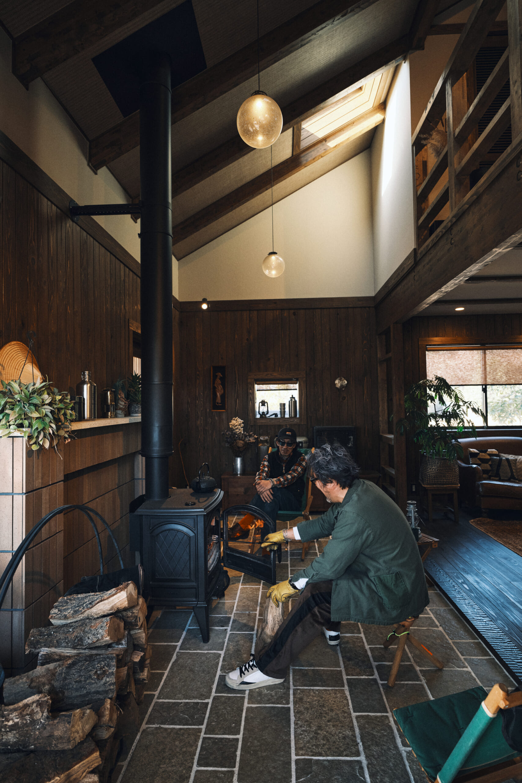 薪ストーブ前でくつろぐ2人。上田さんは過去にアウトドアショップで働いていた経験もあり、外遊びがライフワーク。「薪ストーブも和洋折衷な雰囲気ですね。汚れても掃除しやすい土間は、バイクや自転車も置けるので、寒い時期はここでメンテできるのがいい」。