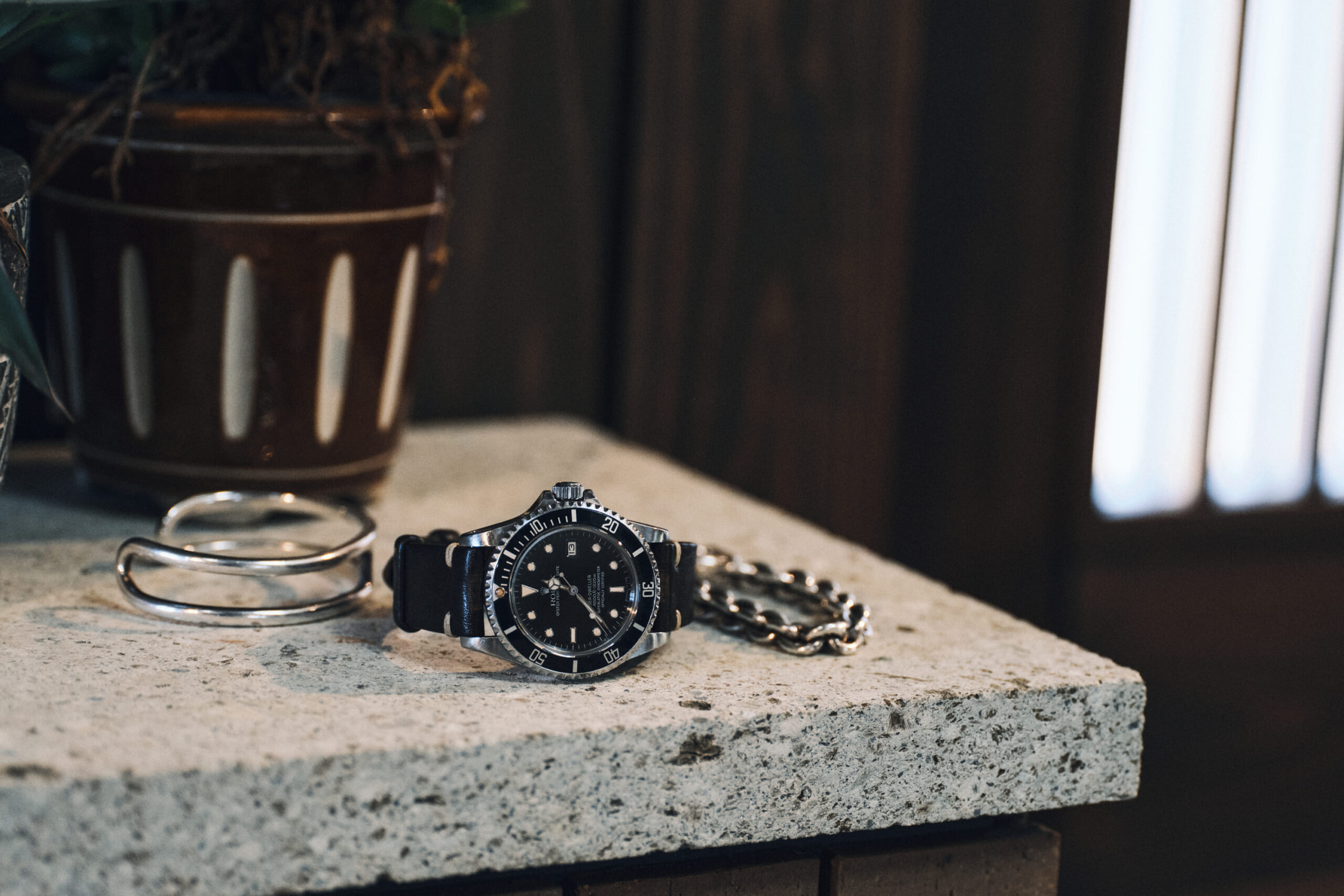 ギアも身につけるアイテムも経年による味わいを楽しめるものが好み。暖炉の上に置かれた時計はロレックスのシードゥエラー666。「やっぱり古いものが好き。これも、会社をはじめた時に新品と迷いましたがあえて中古で買いました」。