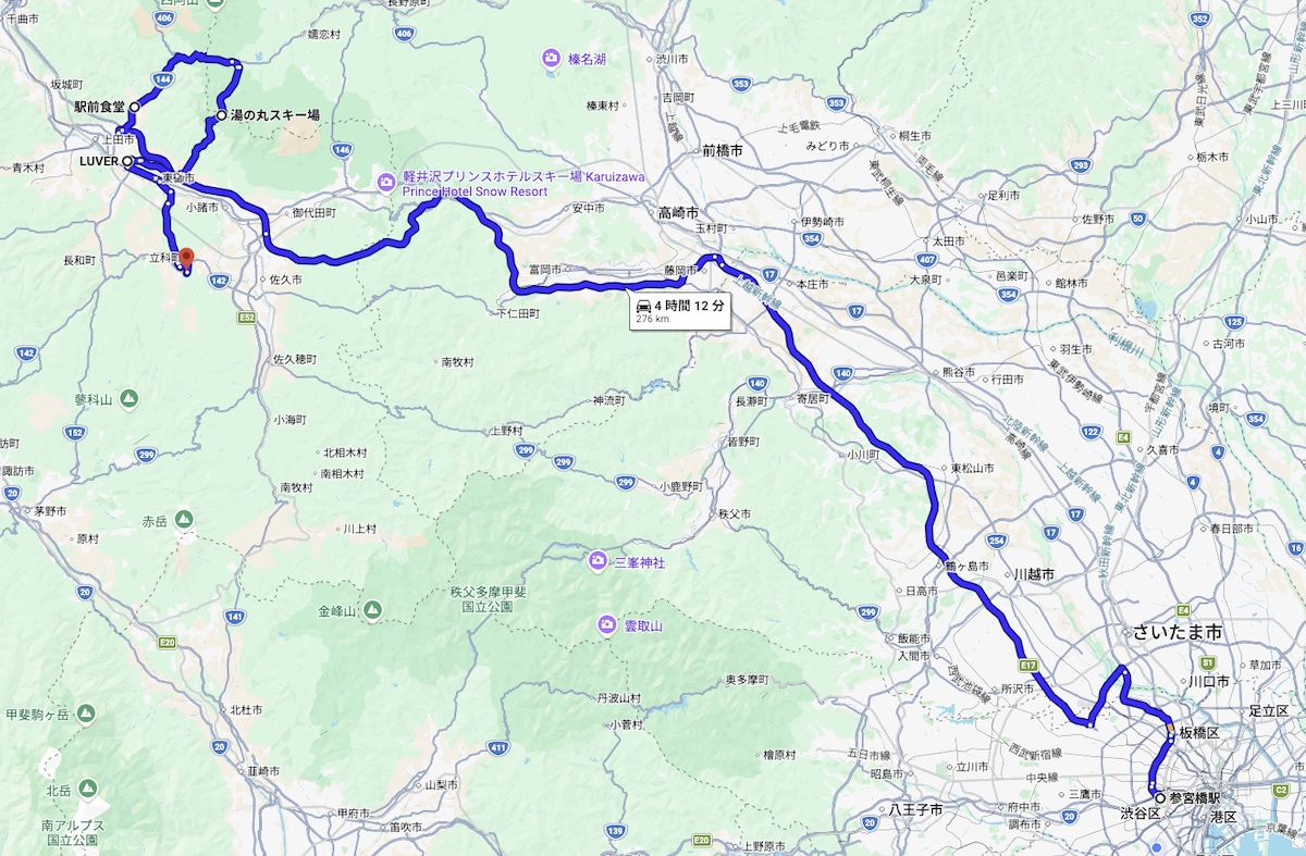 2人を連れてスキー場へ行こうと計画を立てたのが2月上旬。そこから1ヶ月ほどが経過し、スキー場に雪があるのか不明なまま集まったのが2月下旬。今日は都内を出発し、長野・上田付近へ行くルート。