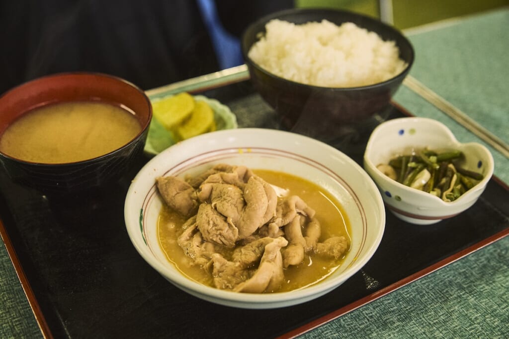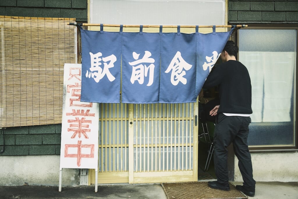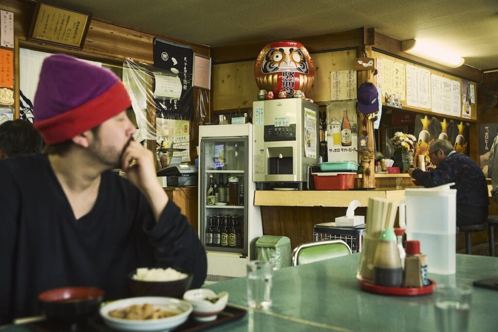 スキー場へ行く前に、まずは腹ごしらえから。この日は、最近このあたりに新たな拠点を作っているカメラマンの紹介で、渋い食堂にやってきた。外観からすでに、うまさが伝わってくる。