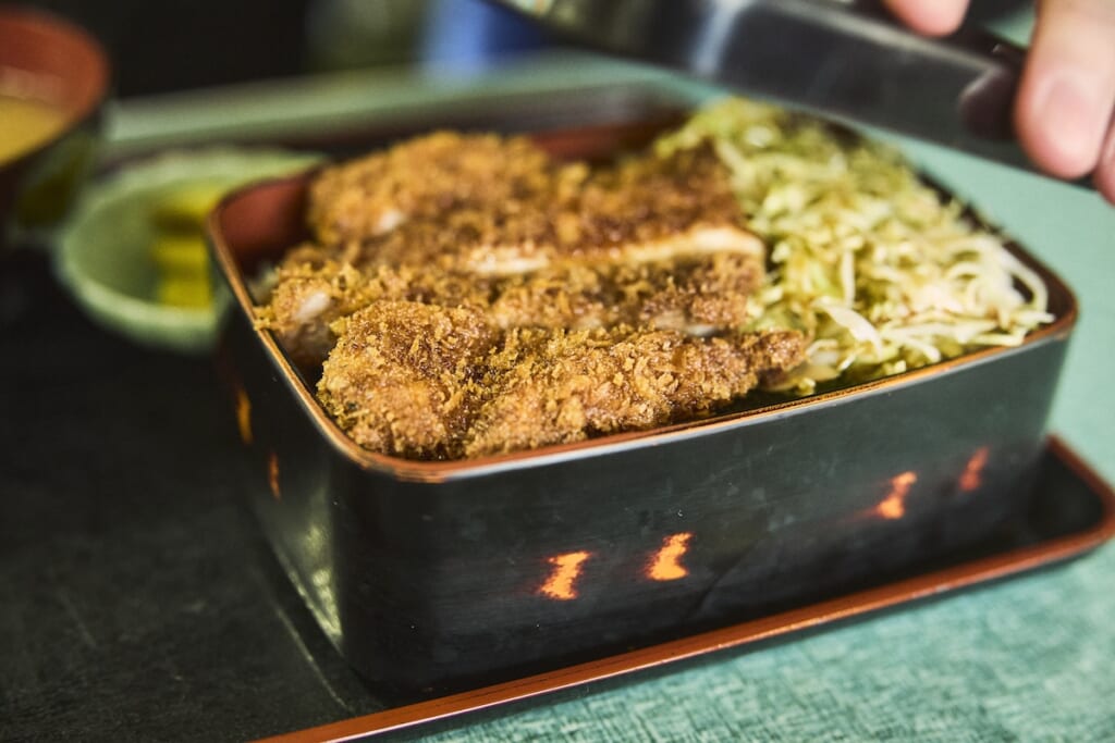 ここの名物は、なんといってもモツ煮。大ぶりで、甘辛い味噌で煮たモツは、運動前のエネルギー補給にもうってつけだ。カツ重もうまい。卵でとじるタイプではなく、上信越地方でよく見られる、タレにくぐらせたタイプのやつ。