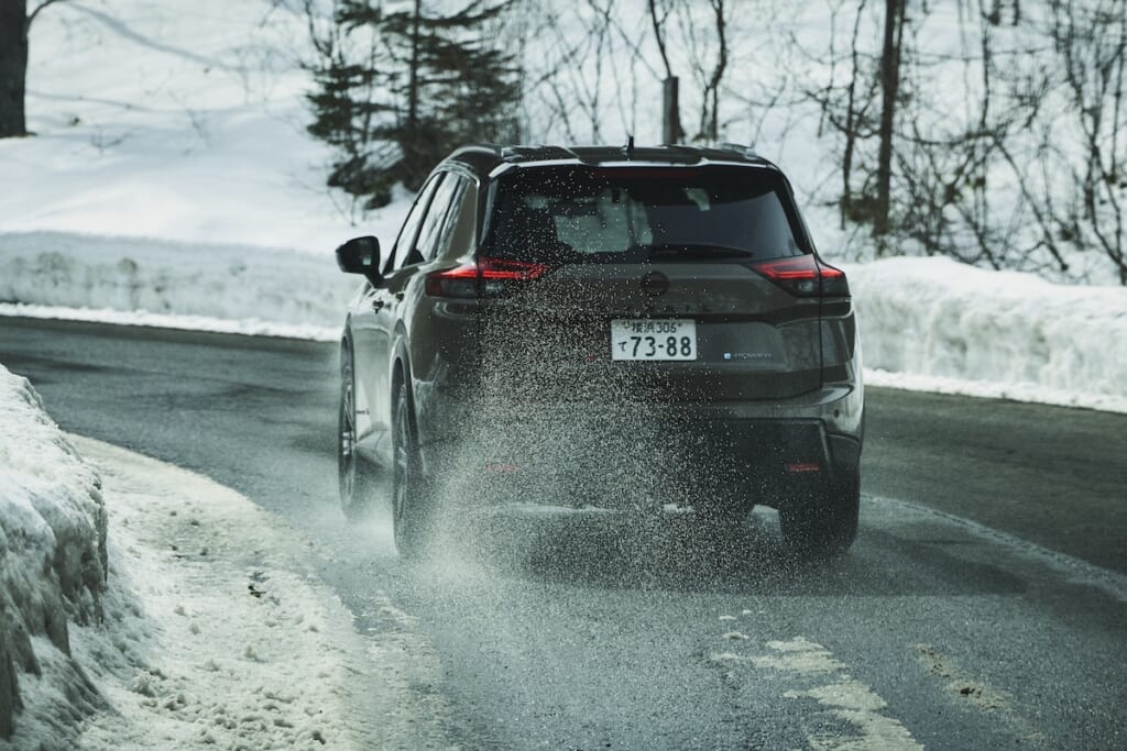 今回乗っているe-4ORCEは、2つのモーターで前後の駆動力を緻密に制御することで、雪も坂も関係なく、ぐいぐい進む。さらにSNOWモードたるものも搭載されていて、同じく2つのモーターによって力をコントロールし、滑りやすい路面でも安定した走行を叶えてくれる。やっぱりこのクルマは、雪を巻き上げる姿もサマになる。