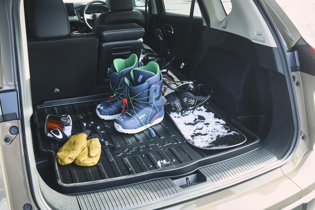 スキーやスノーボードへ行くとなると、荷物がとにかく増えてしまうもの。冒頭で佐藤さんも言っていたけれど、「エクストレイル」は荷台は広々で、2人分の荷物を詰め込んでもまだスペースに余裕がある。ディーラーオプションである防水仕様の「ラゲッジトレイ」を用意したなら、泥や雪がついていても気兼ねなく荷物を置けるし、汚れたなら取り出して水で洗えばいい。
