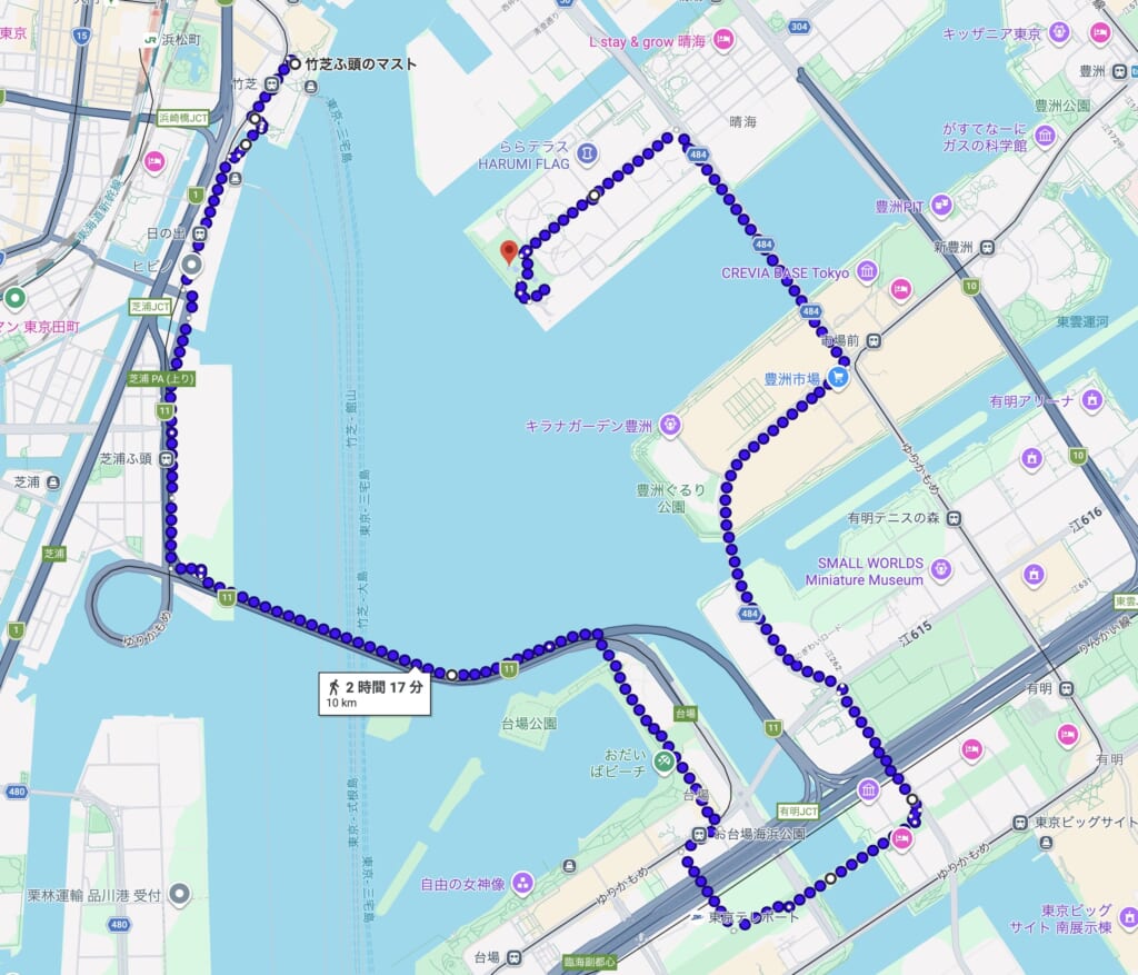 東京湾のさまざまな景色を堪能できる今回のルートは、竹芝から晴海埠頭までの10kmほどのコース。