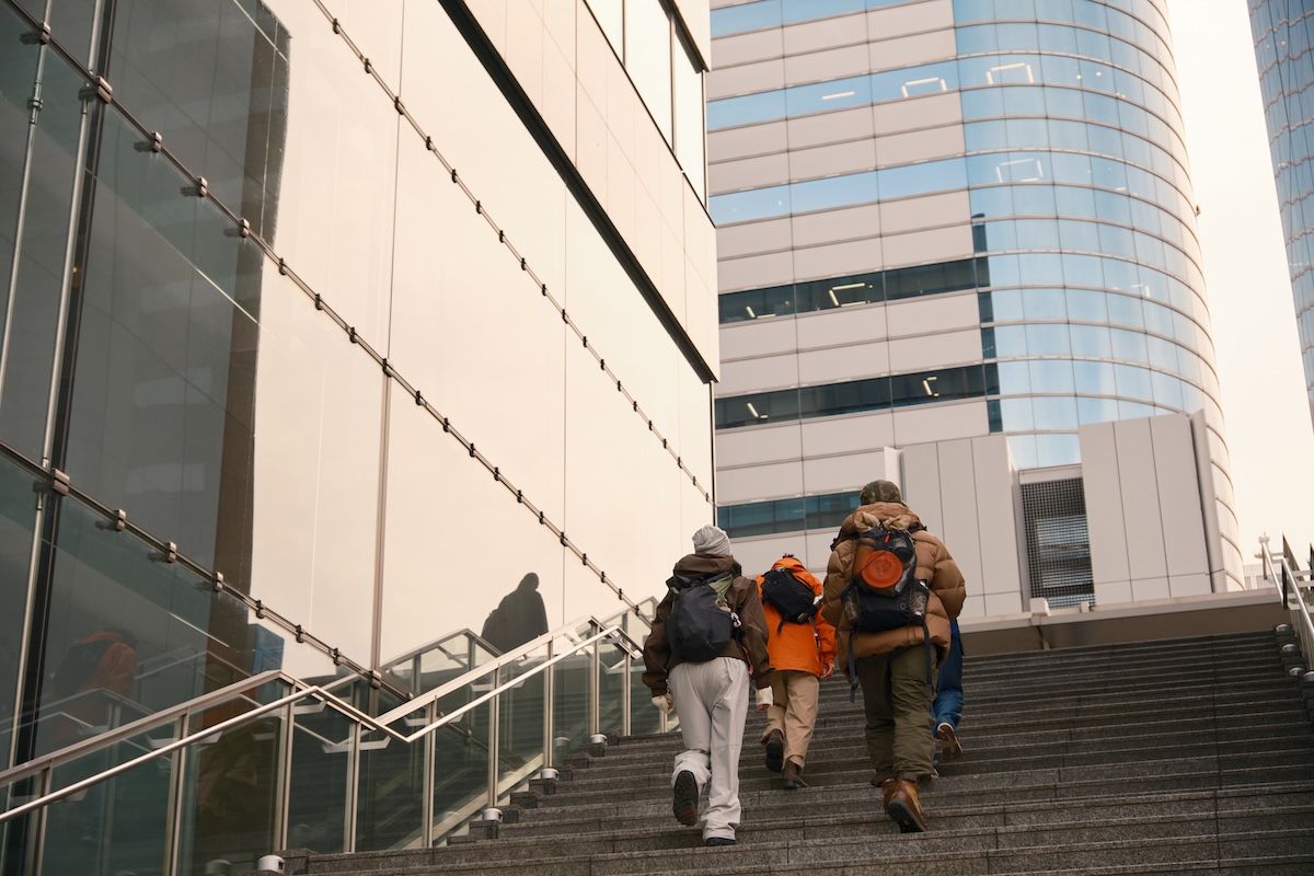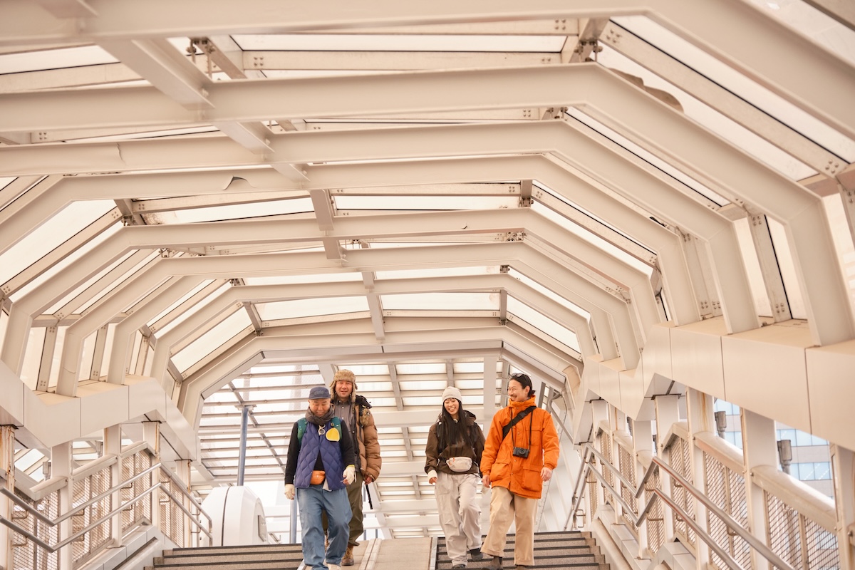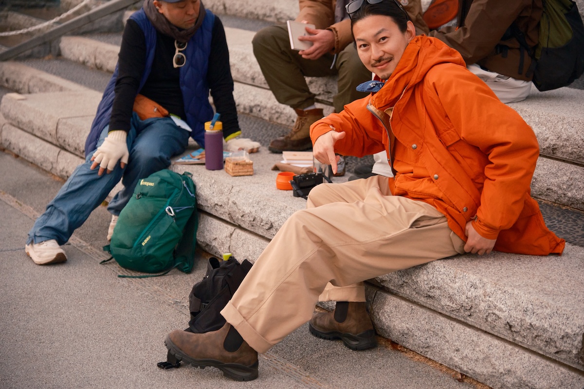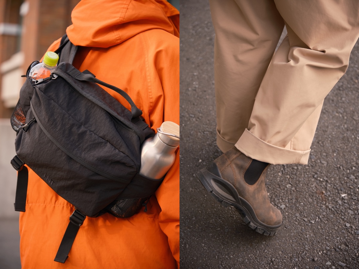 アーバンな街並みを歩くなか、4人のバッグとシューズを拝見。前原さんは自身がディレクションする新ブランド「HNTのヒップバッグ」を愛用。足元は「ブランドストーンのサイドゴアブーツ」をセレクト。