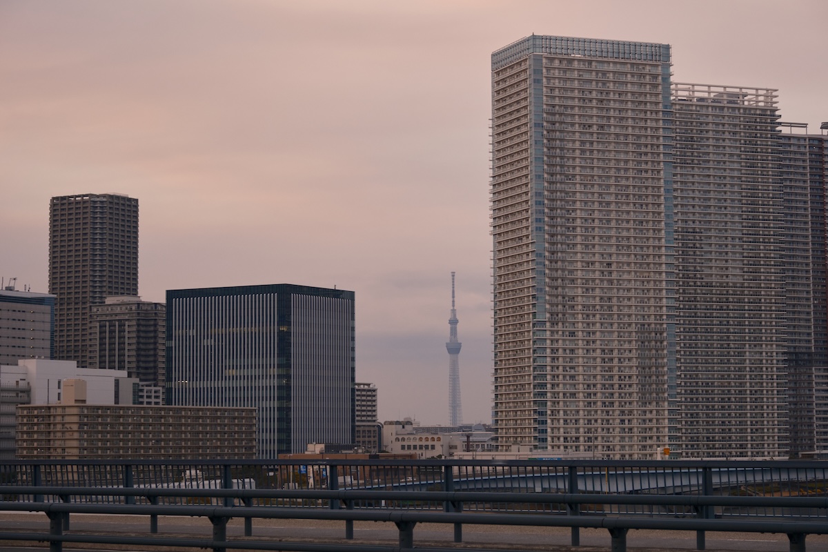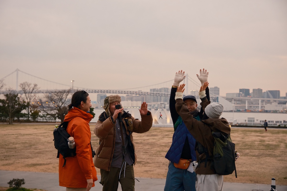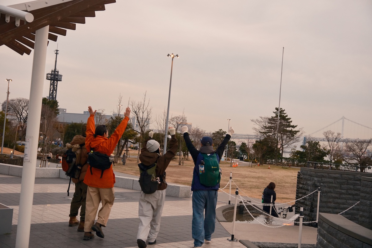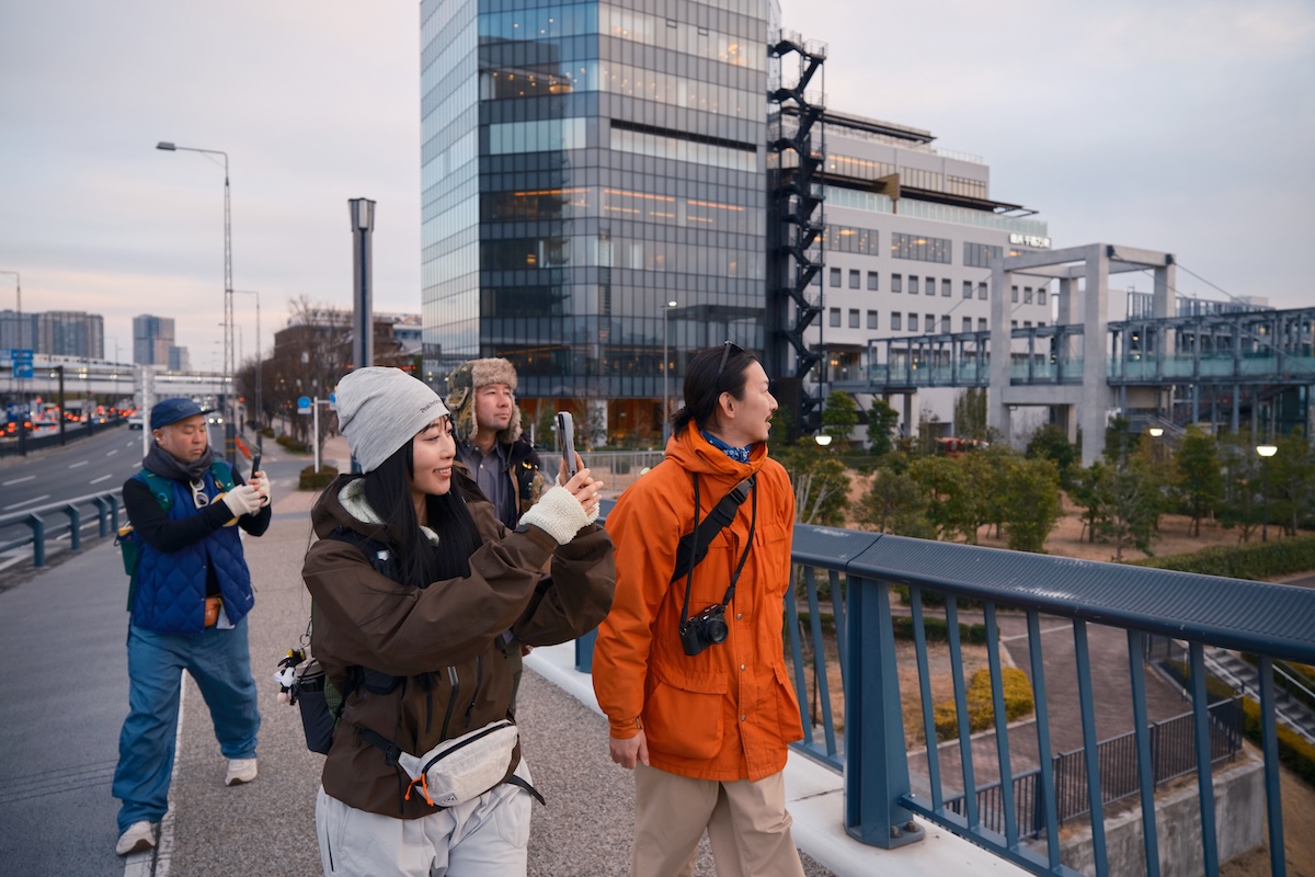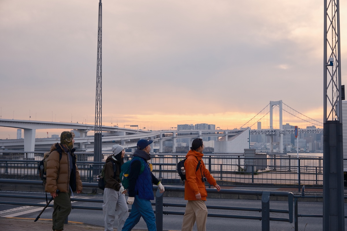 「豊洲大橋」はビルの隙間からスカイツリーが見えるビューポイントがあるなか、茜色に染まっていく東京湾が美しく、4人とも自然とカメラやスマホに手が伸びていた。湾岸ハイクは夕暮れ時が狙い目かも?