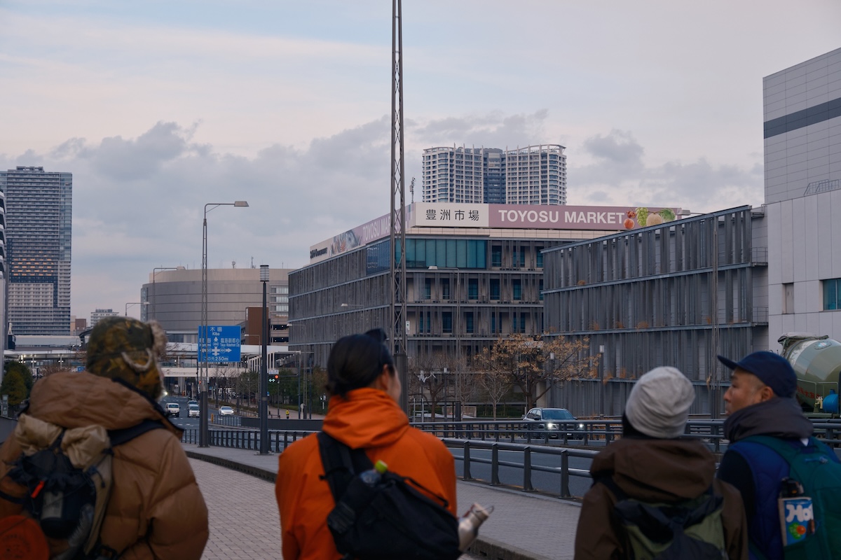 そして、一行は有明から「富士見橋」を渡って豊洲エリアへ。目前には臨海副都心のビル群が立ち並び、夕焼けに染まるレインボーブリッジの姿も見える。