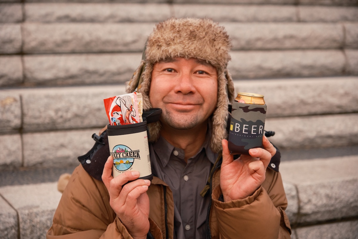キャンさんはお気に入りの缶ビールと、昔ながらの駄菓子を持参。ビールはクージーに入れて保冷対策もバッチリ。
