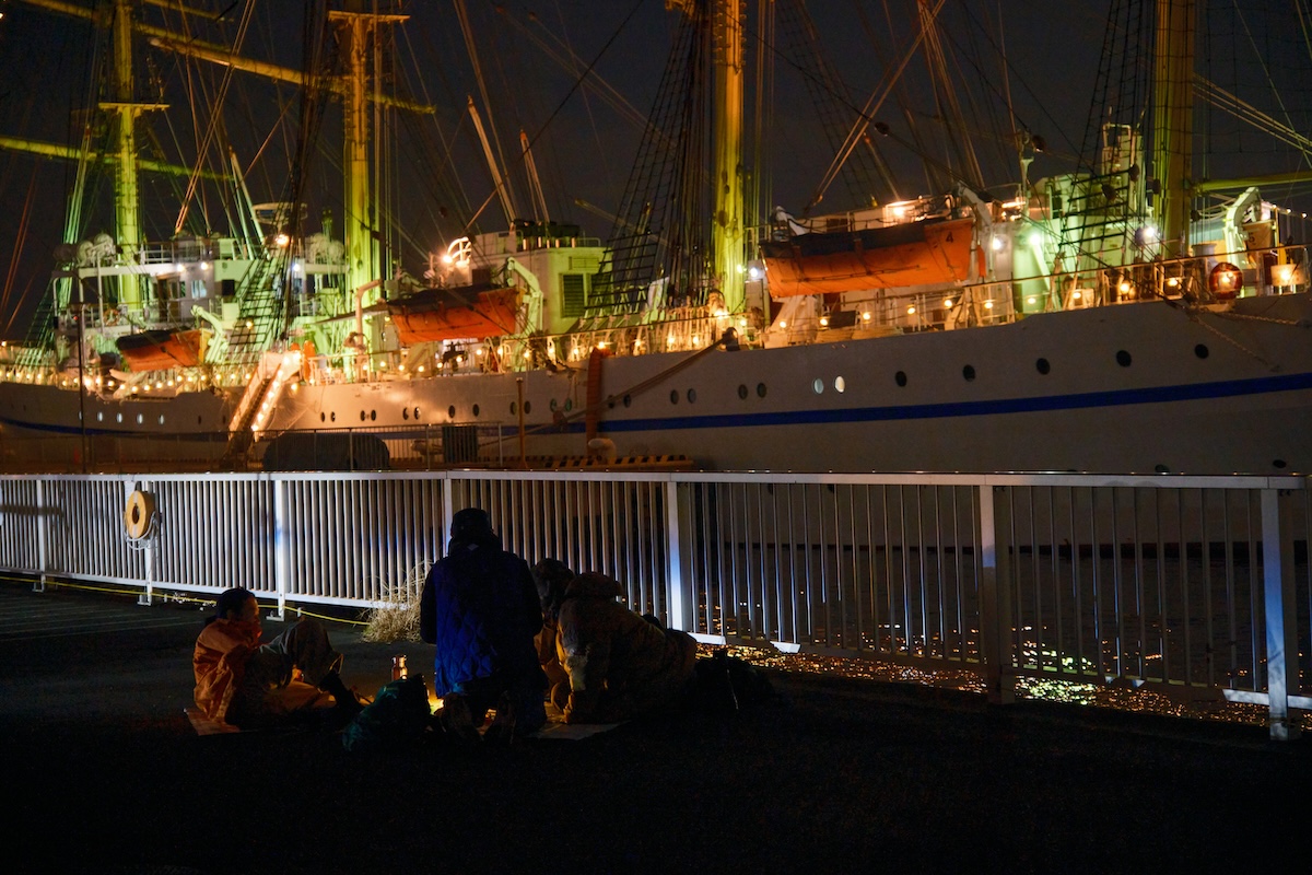 この日は晴海埠頭に「帆船日本丸」が停泊していたが、マストを綴るイルミネーションが施され、夜景に負けずとも劣らない幻想的な船体を披露していた。