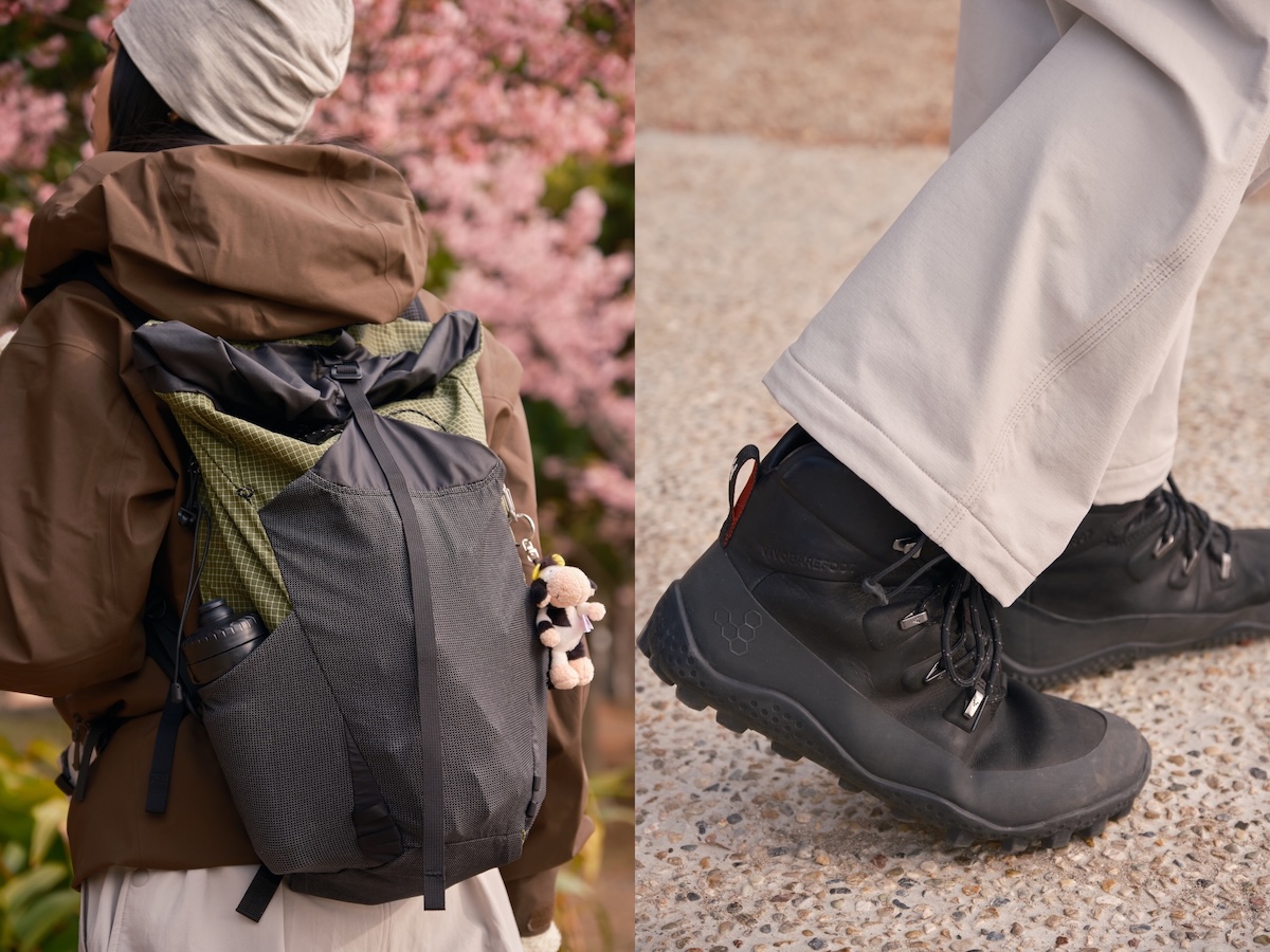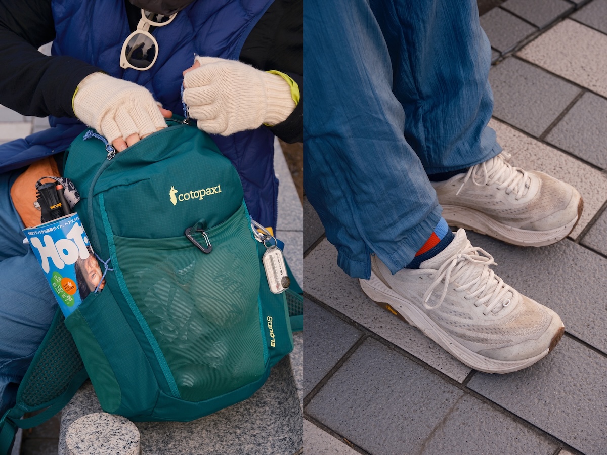 「このバッグは軽くて動きやすいし、シティハイクにもちょうどいいサイズ感。シューズは昨年末に買ったばかりで、いまは街で履いて慣らしている最中です」