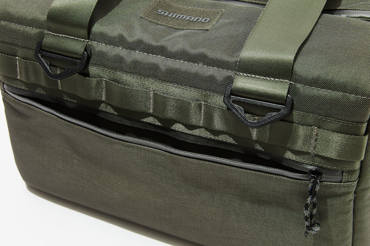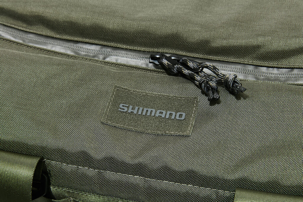 メイン気室は中央開閉式となっており、当然のように止水ジップを採用。同系色でさりげなく配されたSHIMANOロゴは、ベルクロワッペンを貼って隠すこともできるというニクい仕様。