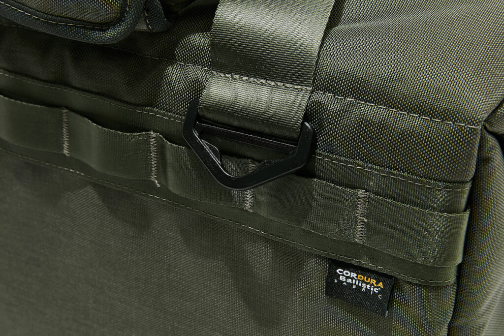 表地には1260Dのコーデュラバリスティックナイロンを採用。モールシステムは前後両面に配されているので、ギア類をハンギングしたり、モール対応のポーチ等で拡張も可。