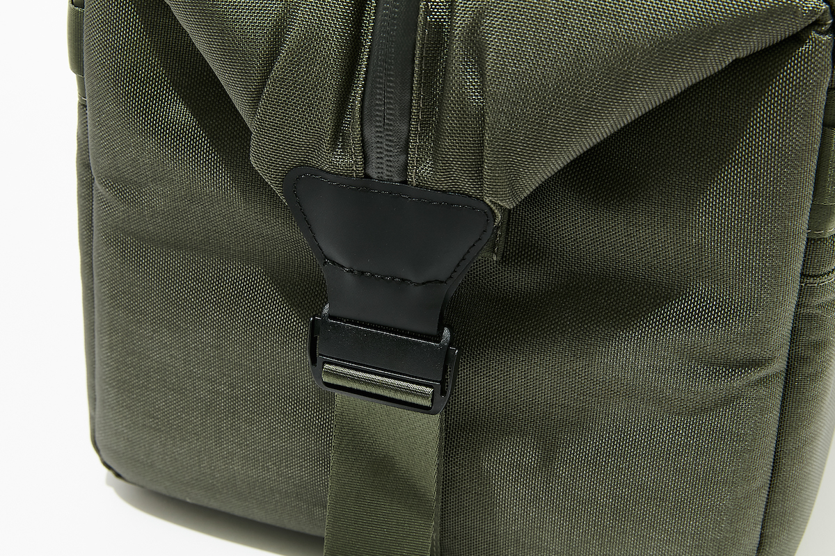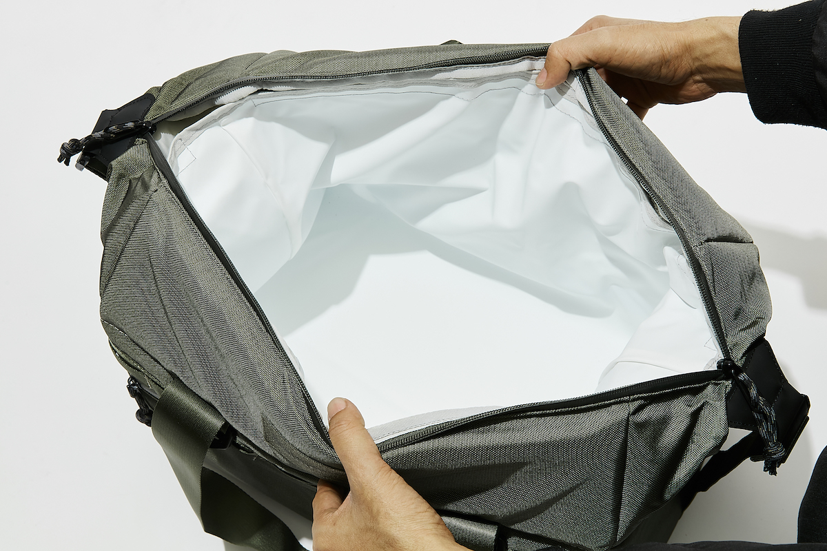 センタージップは両サイドのコンプレッションストラップを緩めて開閉するのだが、これは少し面倒だなと感じつつも、緩めたままであればさらにメイン気室の高さを出せる(トートバッグ型になる)ので、買い出ししたものをざっくり入れるときに活躍しそう。
