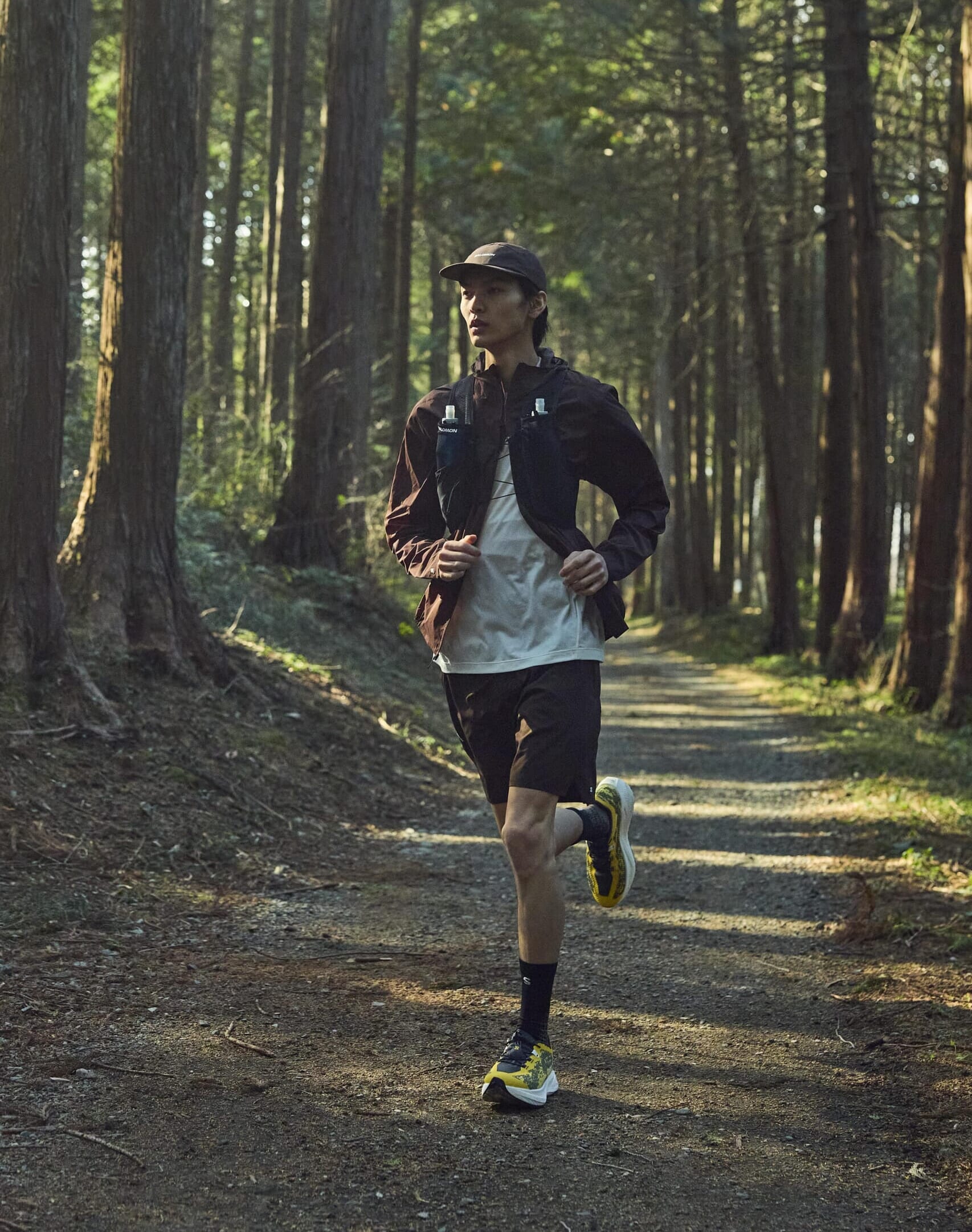 一見するとシンプルに見えるモノトーンのランニングコーデも、ポップなカラーリングのシューズを差し色的に取り入れるだけで、スタイリッシュな雰囲気に。グラベルシリーズはシューズのみならずウエア類も充実しているため、トータルコーデも可能。
