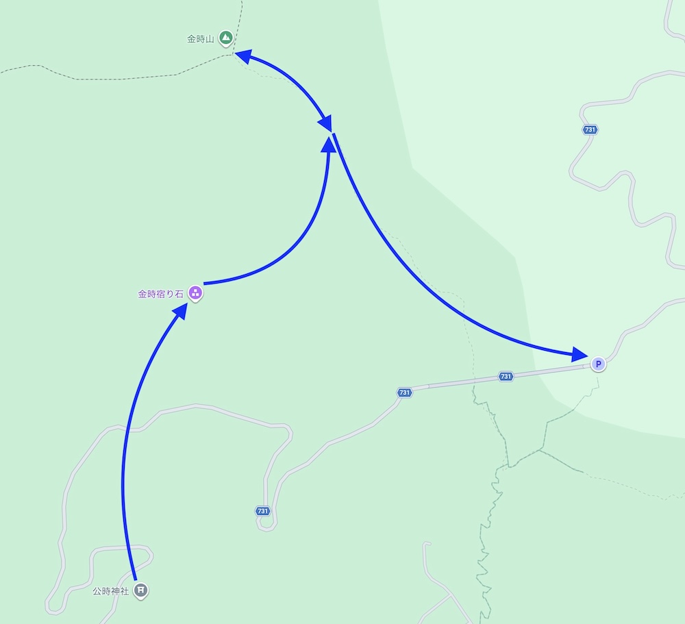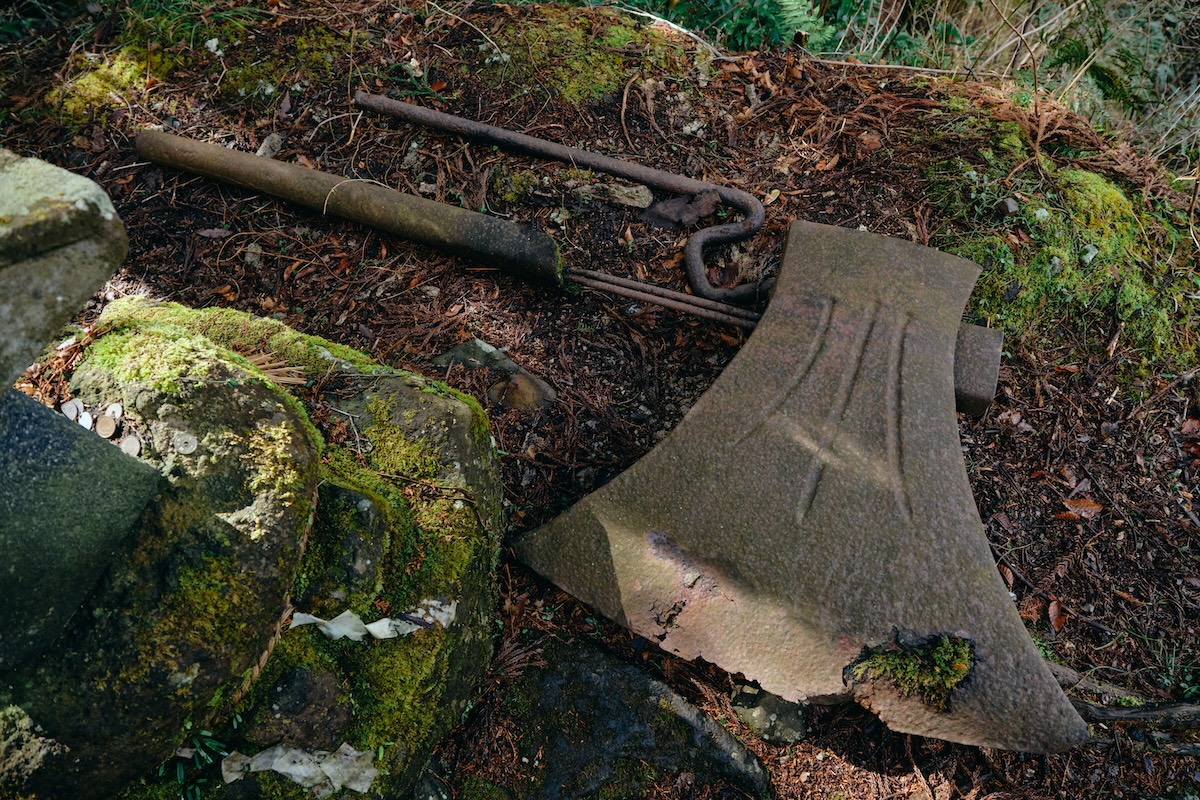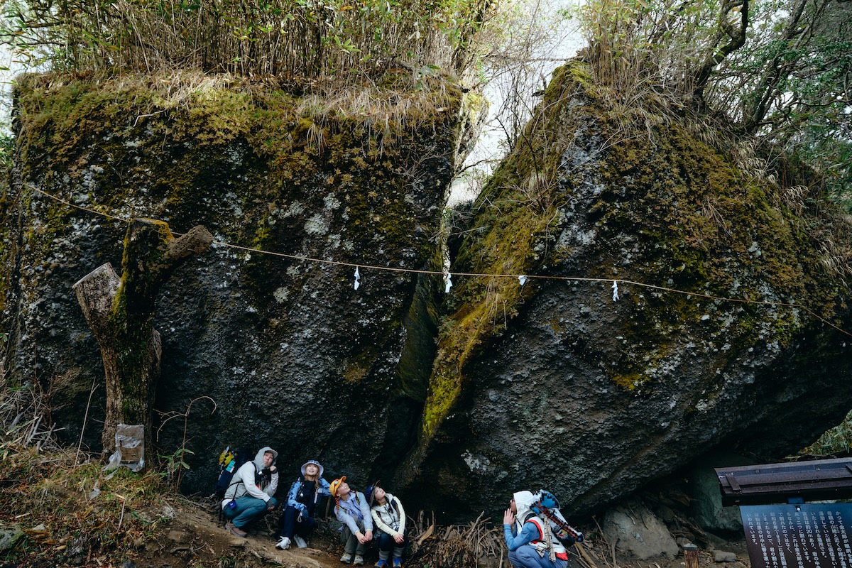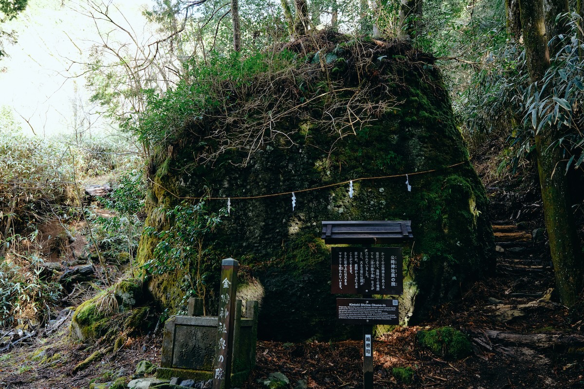そして、巨岩巡りはまだ終わらない。こちらは「公時神社 奥の院」。かつてはこの地に公時神社があったらしい。祠が置かれている大きな岩には裏側から登ることができ、岩の上には巨大なまさかりも祀られていた。