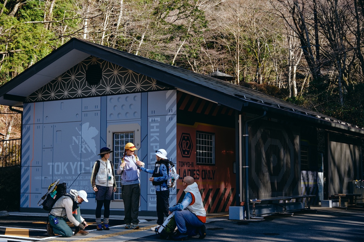 お揃いのベストを着用して、ハイクの身支度を整えるのは、金時公園の駐車場。その一角には、「新世紀エヴァンゲリオン」の施設をイメージした公衆トイレが設置されている。