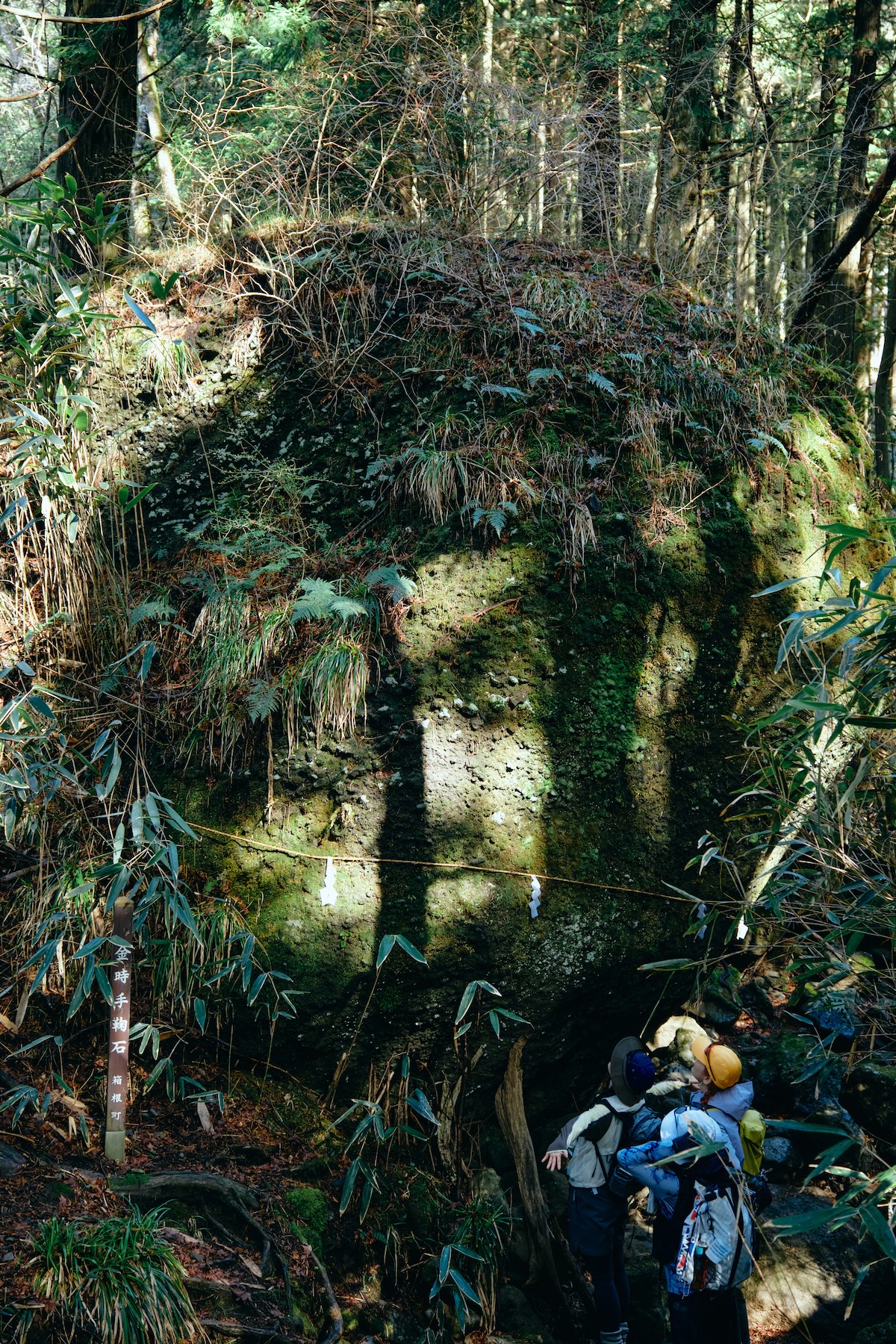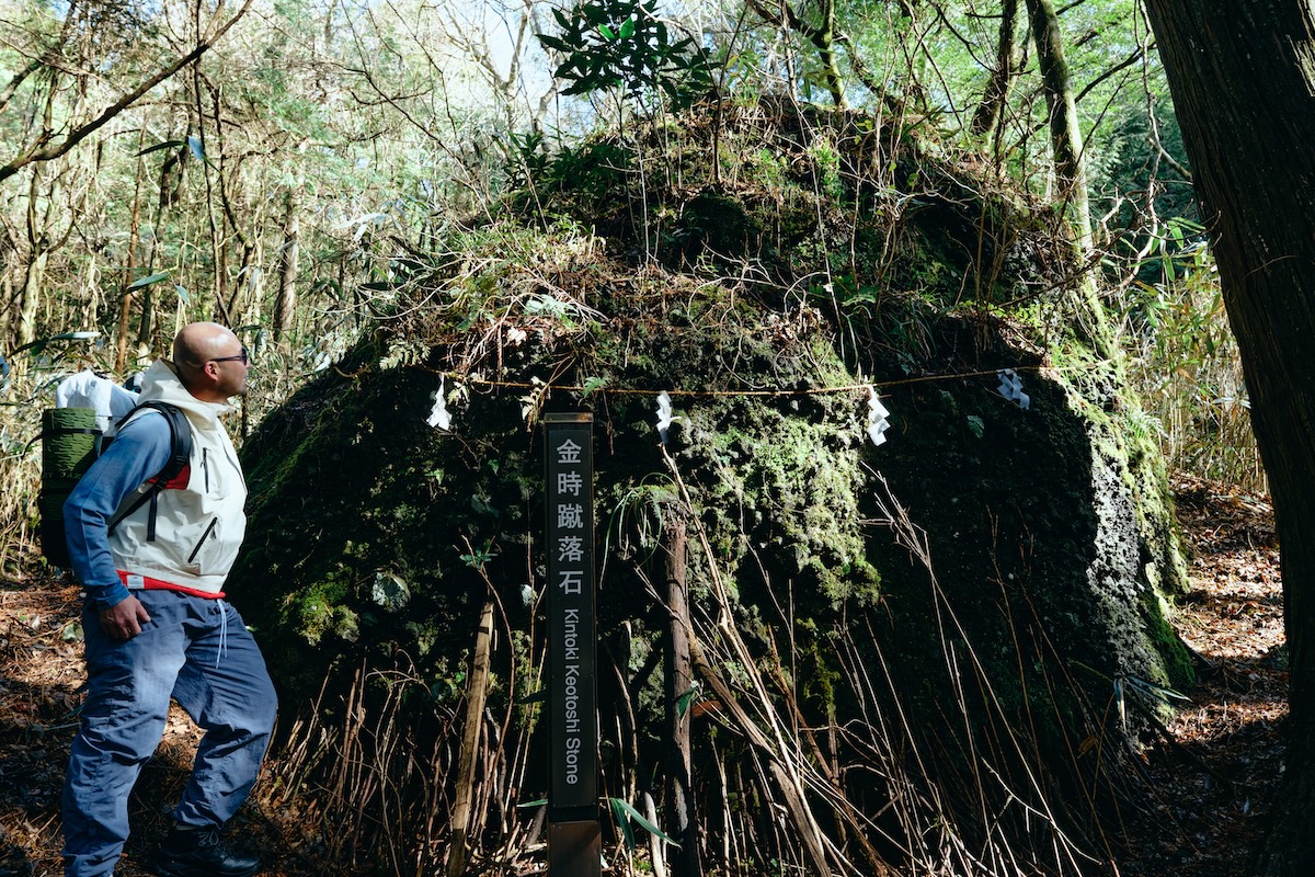 こちらが、このルートの最後の巨岩スポット「金時宿り石」。これまでの岩の中でも最も大きくて迫力があるためラスボス感が満載だけど、解説によると金太郎の仮住まいらしい。