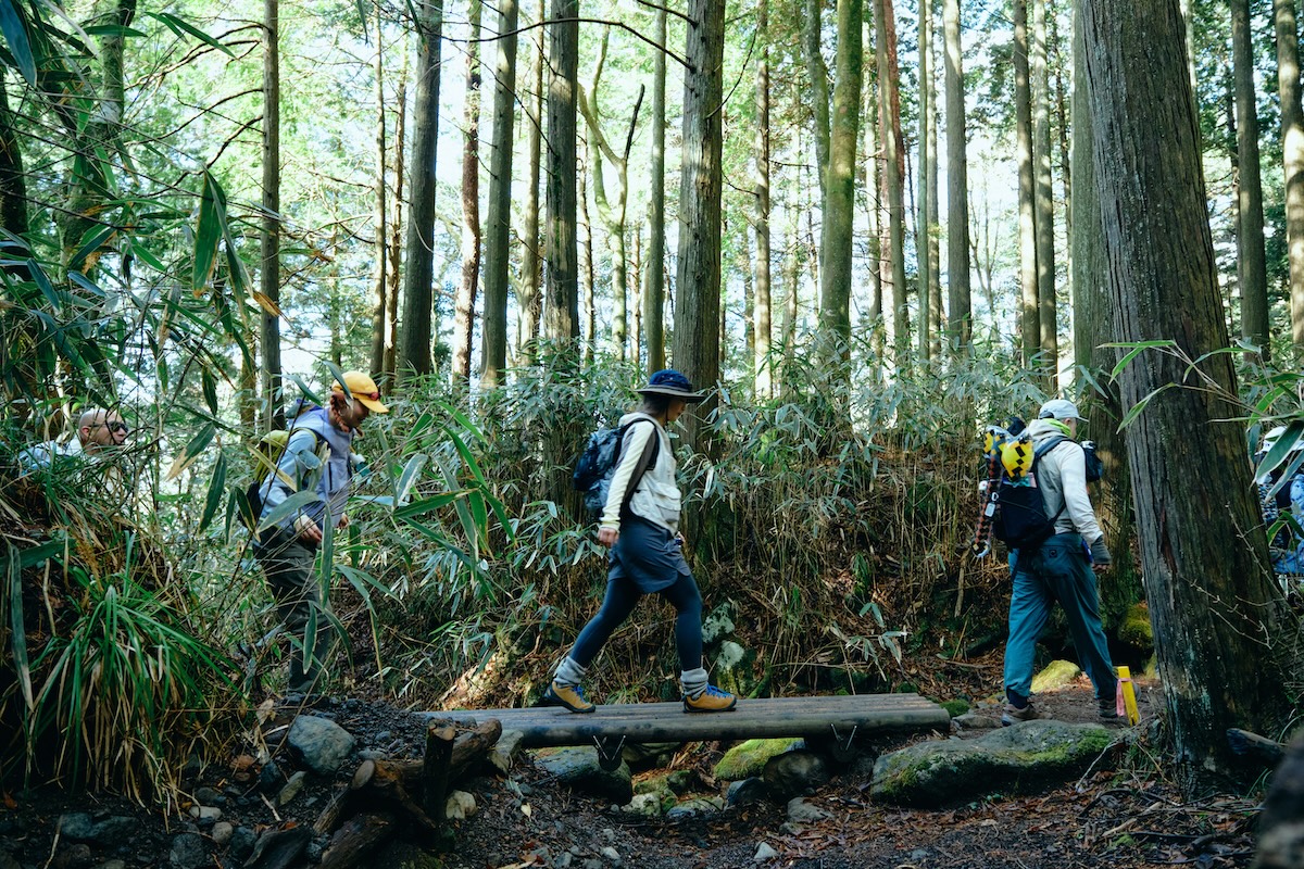宿り石を越えると、急に勾配がきつくなり、つづら折りも増えてきた。その先頭を歩くのは、キャシーさんとチュウさん。しかも元気いっぱいで、常に笑顔で楽しそう。トレランも趣味というYUKIさんも、涼しい顔をしている。