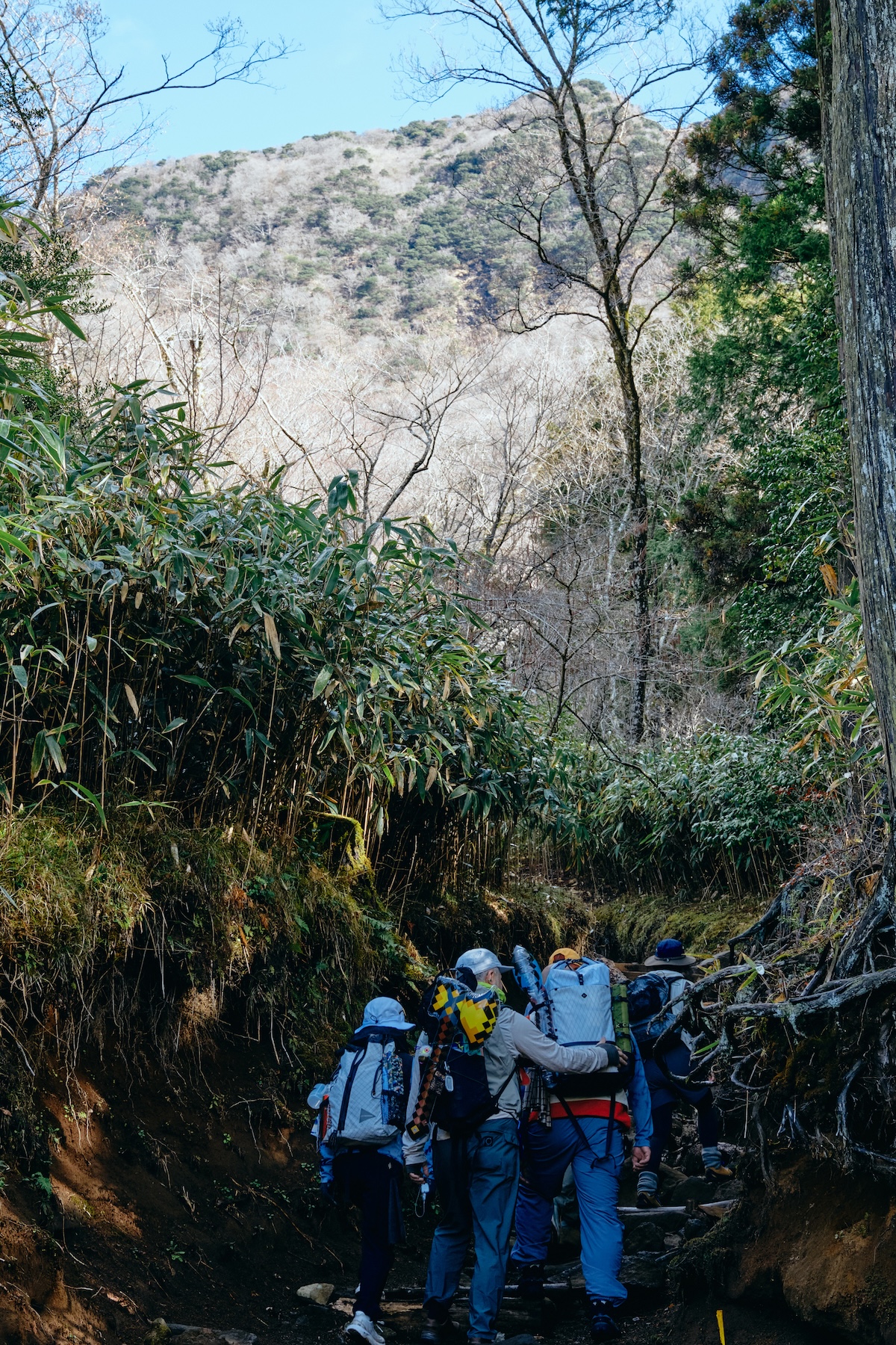 車道を越えると、景色が少しずつ変わり始めた。両側に背の高い笹が生い茂るなか、正面には山頂らしき山肌も見える。