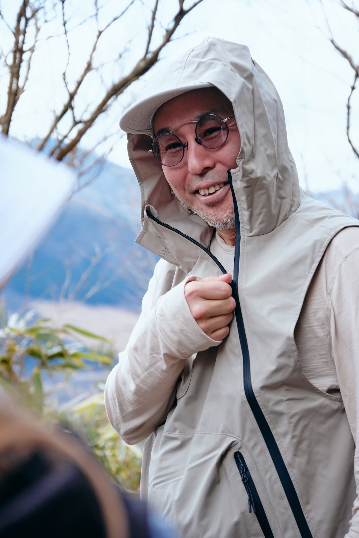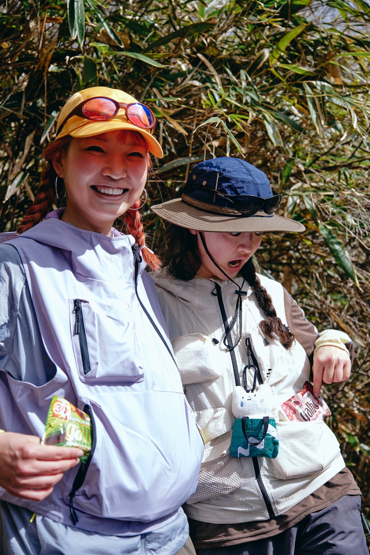 そして休憩中にベストのポケットから日本のお菓子を取り出す2人。どちらのベストも収納力があるため、行動食もスマートに持ち歩ける。一方、辻井さんはファスナーやフードのデザインに注目。