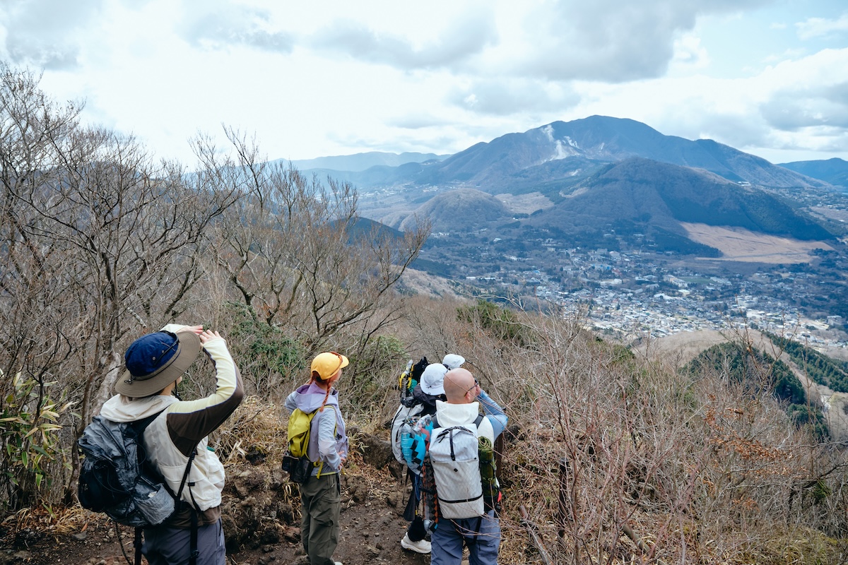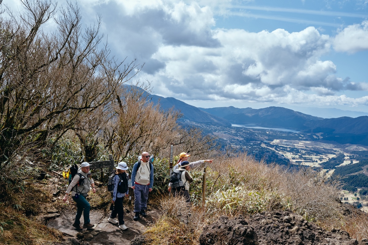 高度が上がるにつれ、どんどん視界も広くなり、振り返ると芦ノ湖や仙石原が一望できる絶景スポットが増えてきた。キャンさんが、眼下に広がる箱根の名所を英語で説明するなど、和気藹々としたムードで撮影タイムが続く。