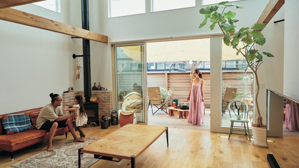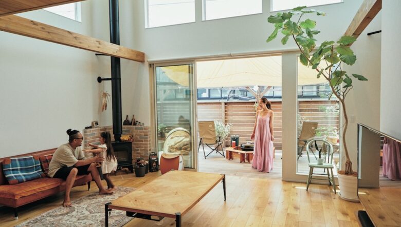 高い天井と大きな窓から優しい外光が降り注ぐ、開放的なリビングが印象的な濵田さん宅。フラットにつながるウッドテラスにはアウトドアギアも常設されている。