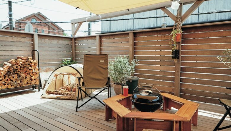 大きなウッドテラスやキッチンブースでアウトドア料理を満喫。