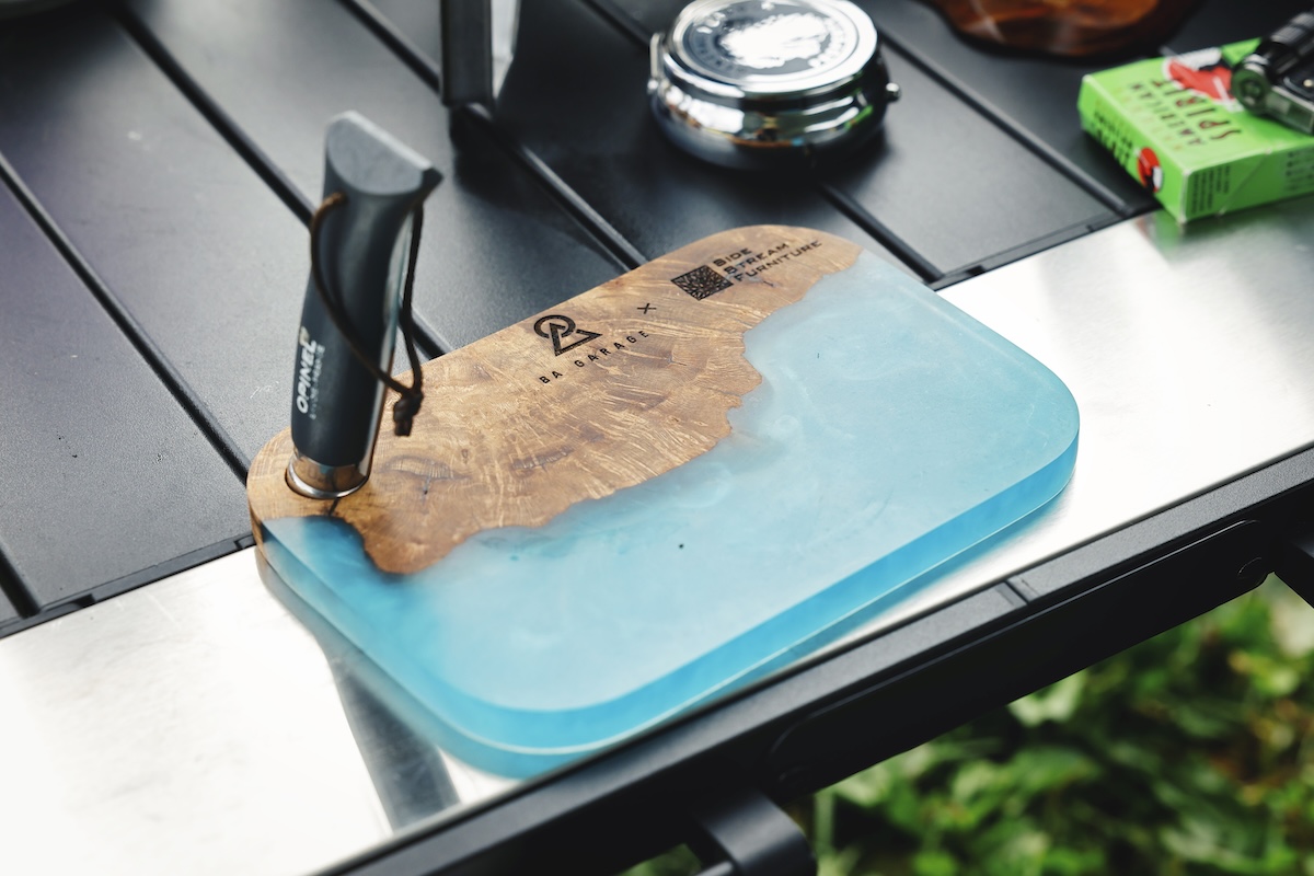 レジンとウッドの組み合わせが美麗なヤエイガレージのカッティングボード。