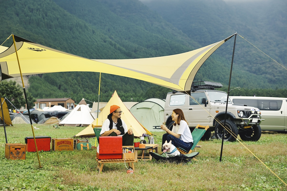 MSRのジングを大きく使い、中央にリビングを設置。 愛犬ししまる用の席も、もちろん用意。前方にバーナーを置き、そちらはキッチンに。後方にはボックス やクーラーを並べて収納場所としている。就寝時のテントはクルマの近くに配置し、モノを取り出しやすいように。