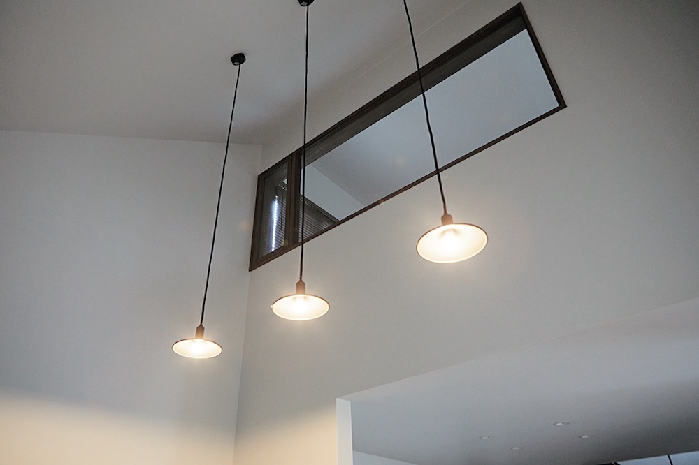 キッチン部分の吹き抜けは、2階の室内窓がアクセントになっている。