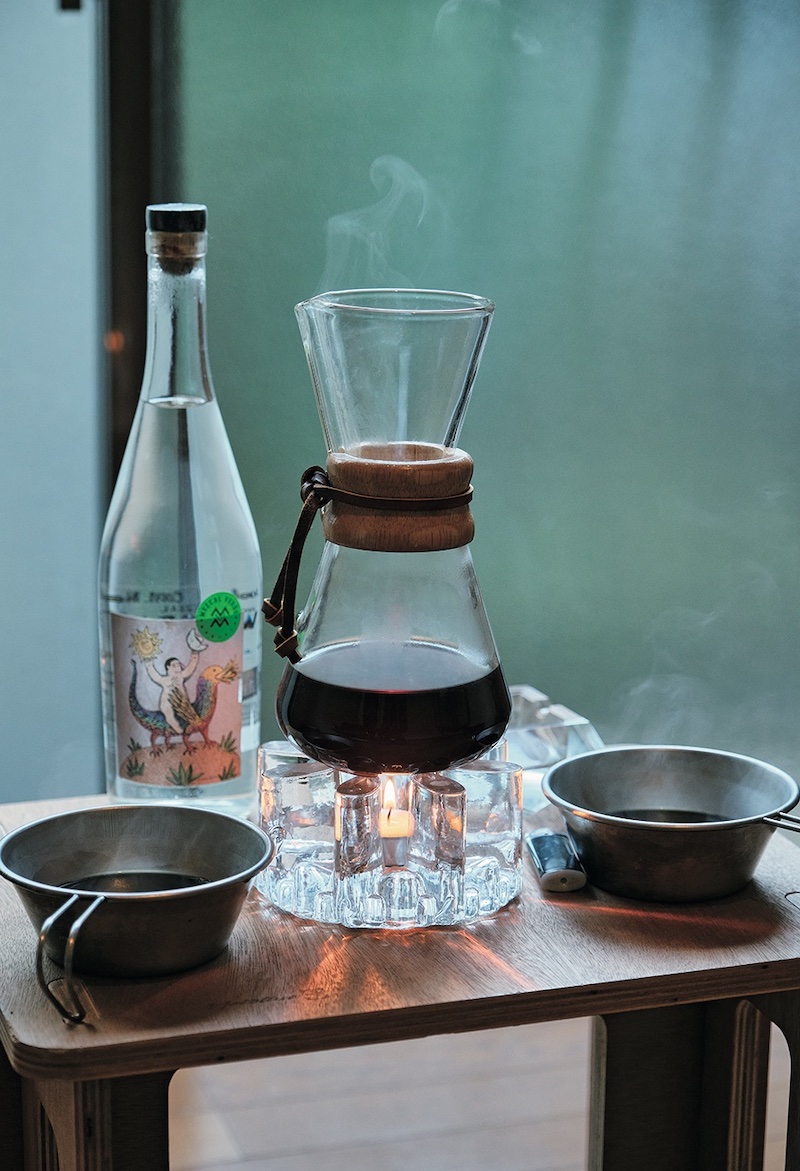 ケメックスのコーヒーメーカーとヴェーエムエフのコーヒーウォーマーをセットで愛用。クライミングブランド、メトリウスのキャンプテーブルも室内で活躍。