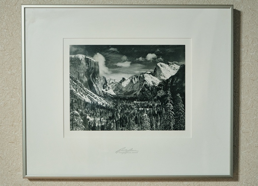 リスペクトする写真家、アンセル・アダムスの作品を額装。「ヨセミテのミュージアムで購入した宝モノ」。