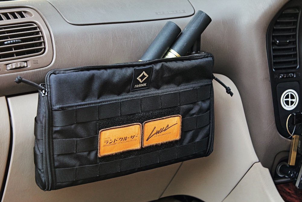 ヘリノックスのタクティカルサイドストレージスリムを助手席前にセット。モーテルランドクルーザーのワッペンも愛用。